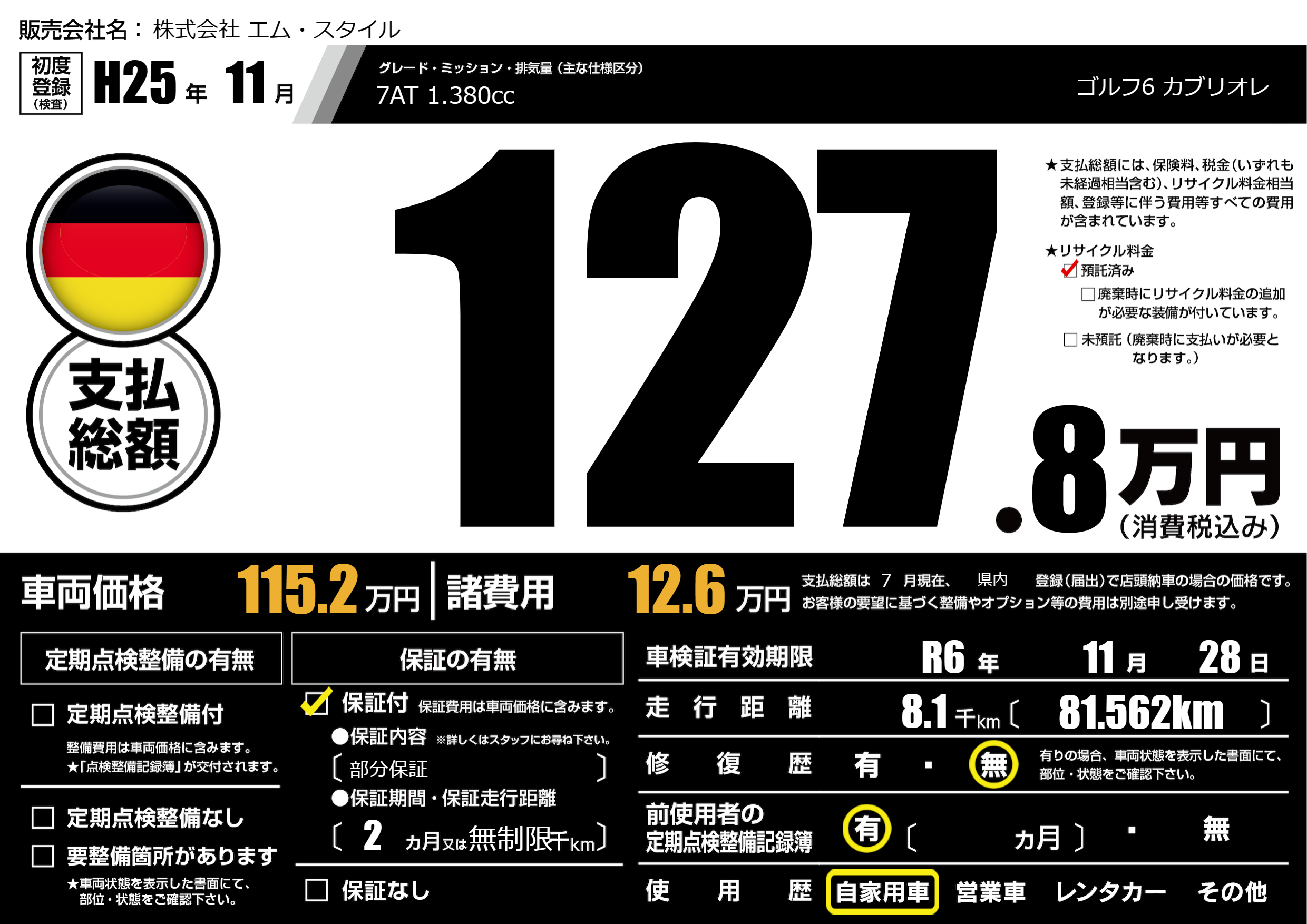 | 車名 | ゴルフ6 カブリオレ | グレード ミッション 排気量 |