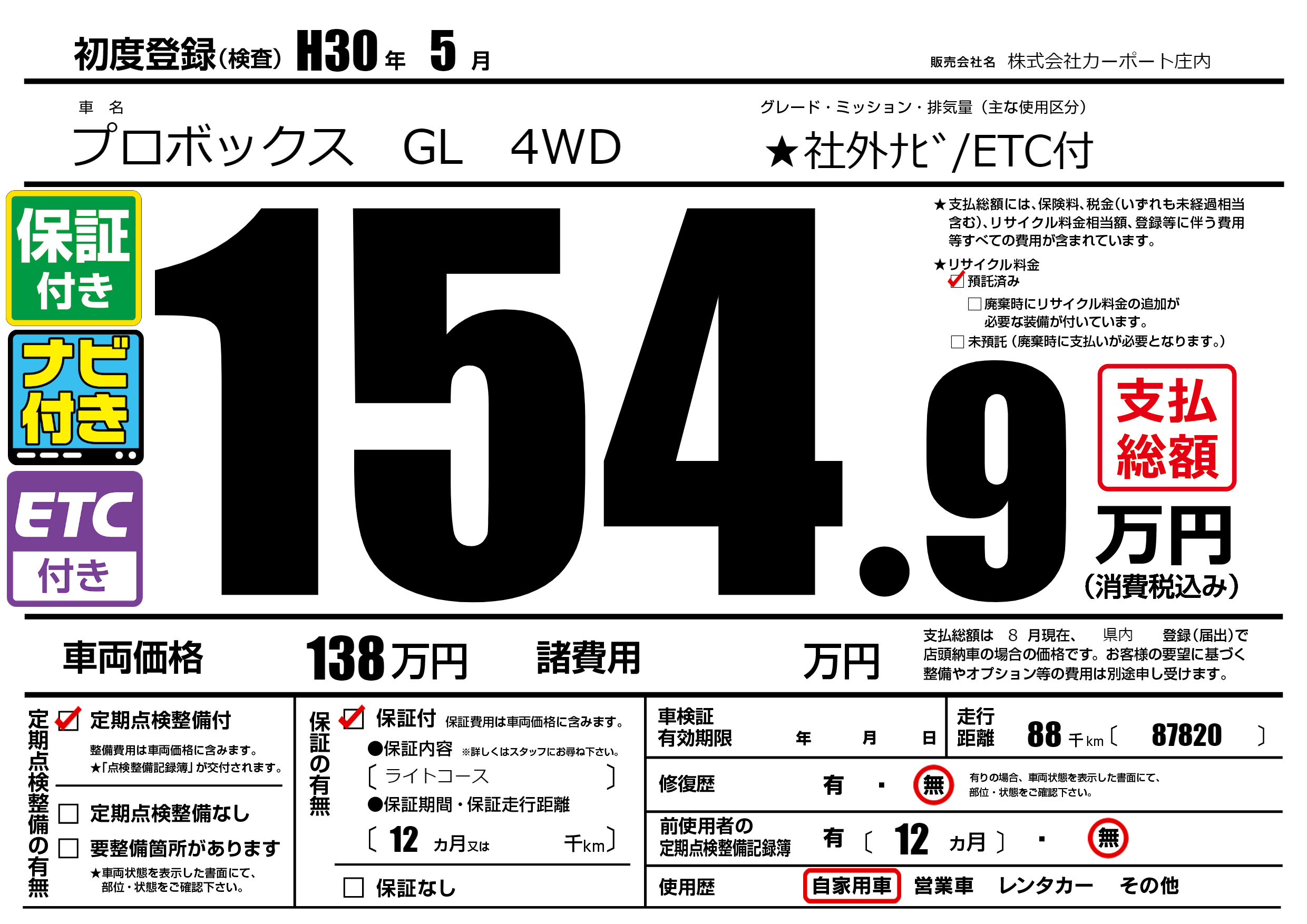 | 車名 | プロボックス GL 4WD | グレード ミッション 排気量 |