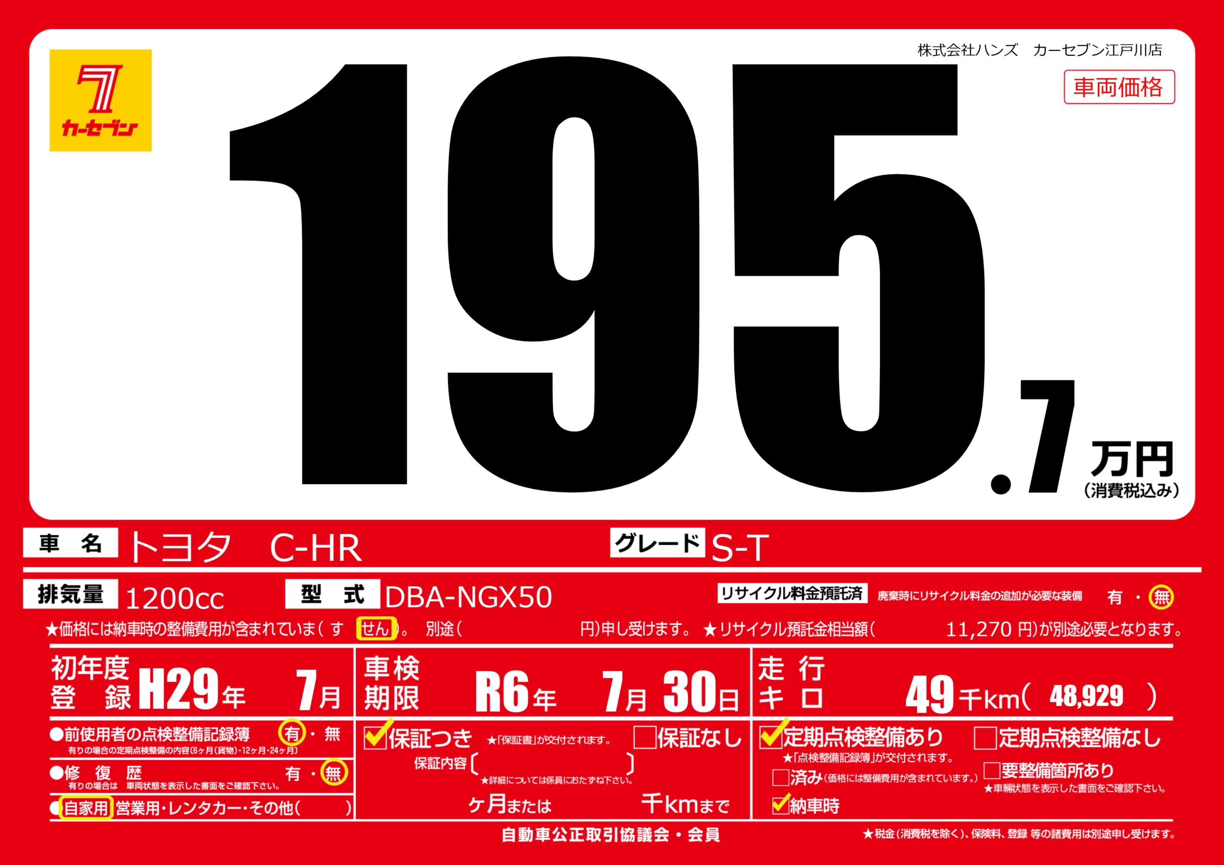 | 車名 | トヨタ C-HR | グレード ミッション 排気量 |