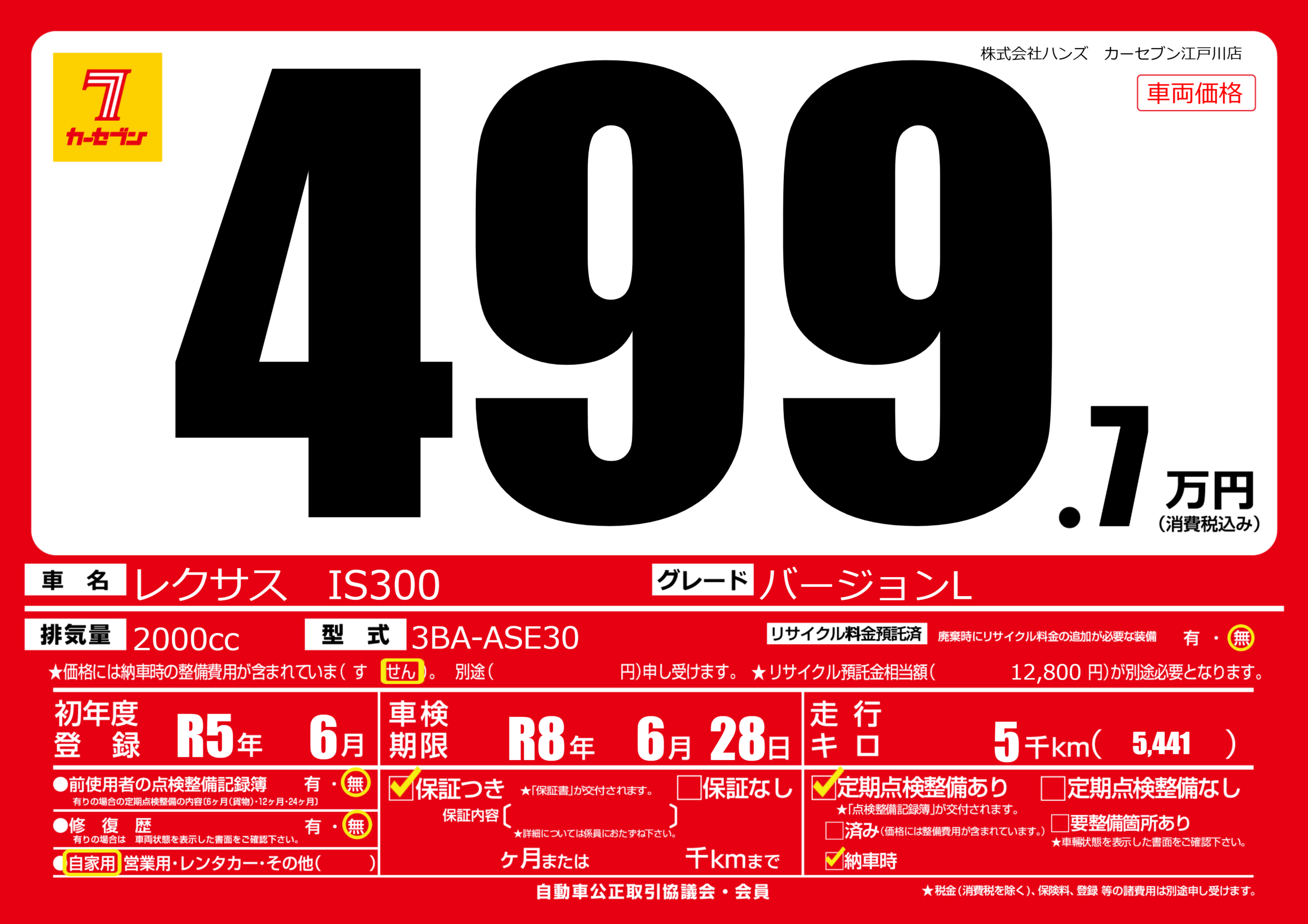 | 車名 | レクサス IS300 | グレード ミッション 排気量 |