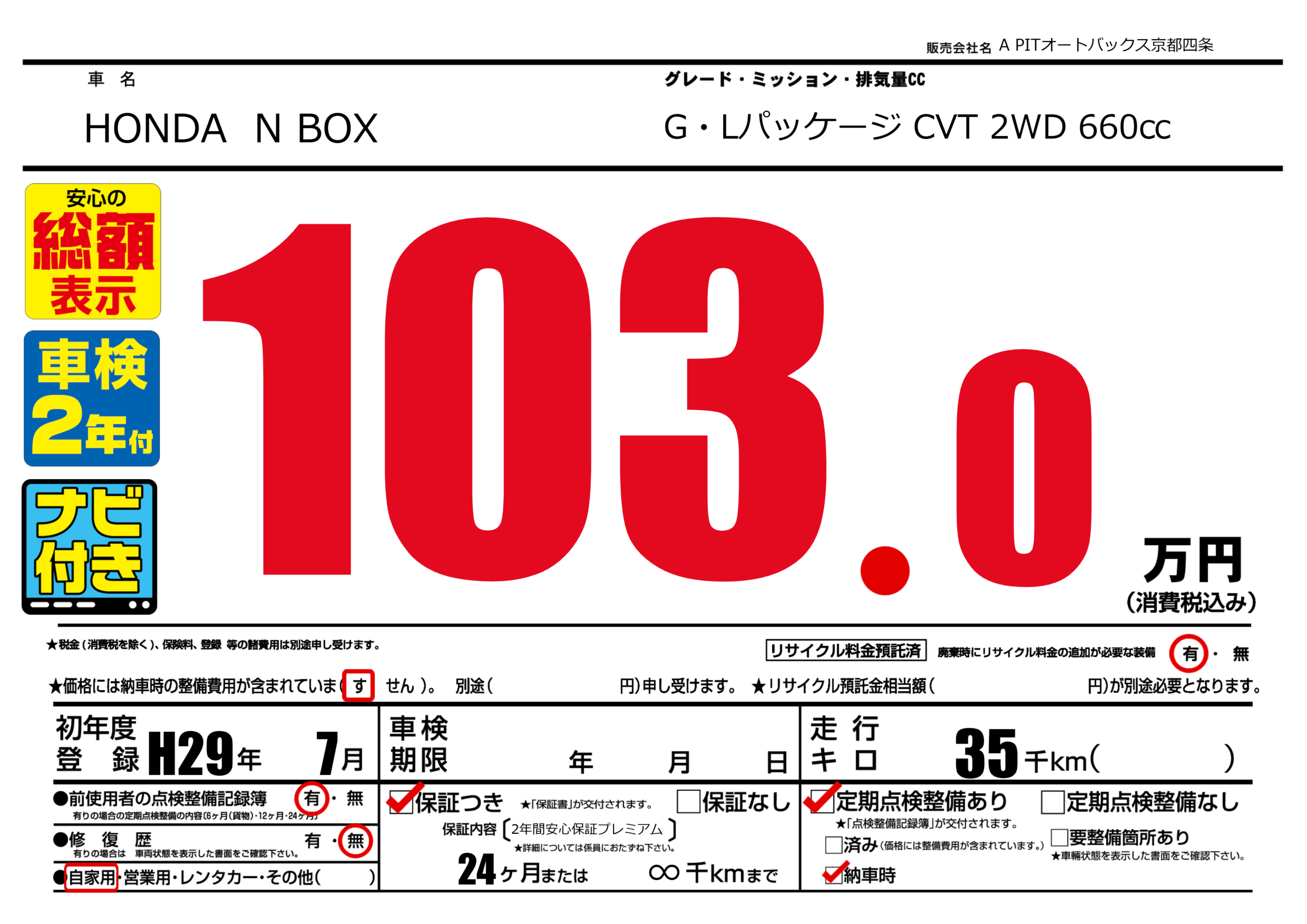 | 車名 | HONDA N BOX | グレード ミッション 排気量 |