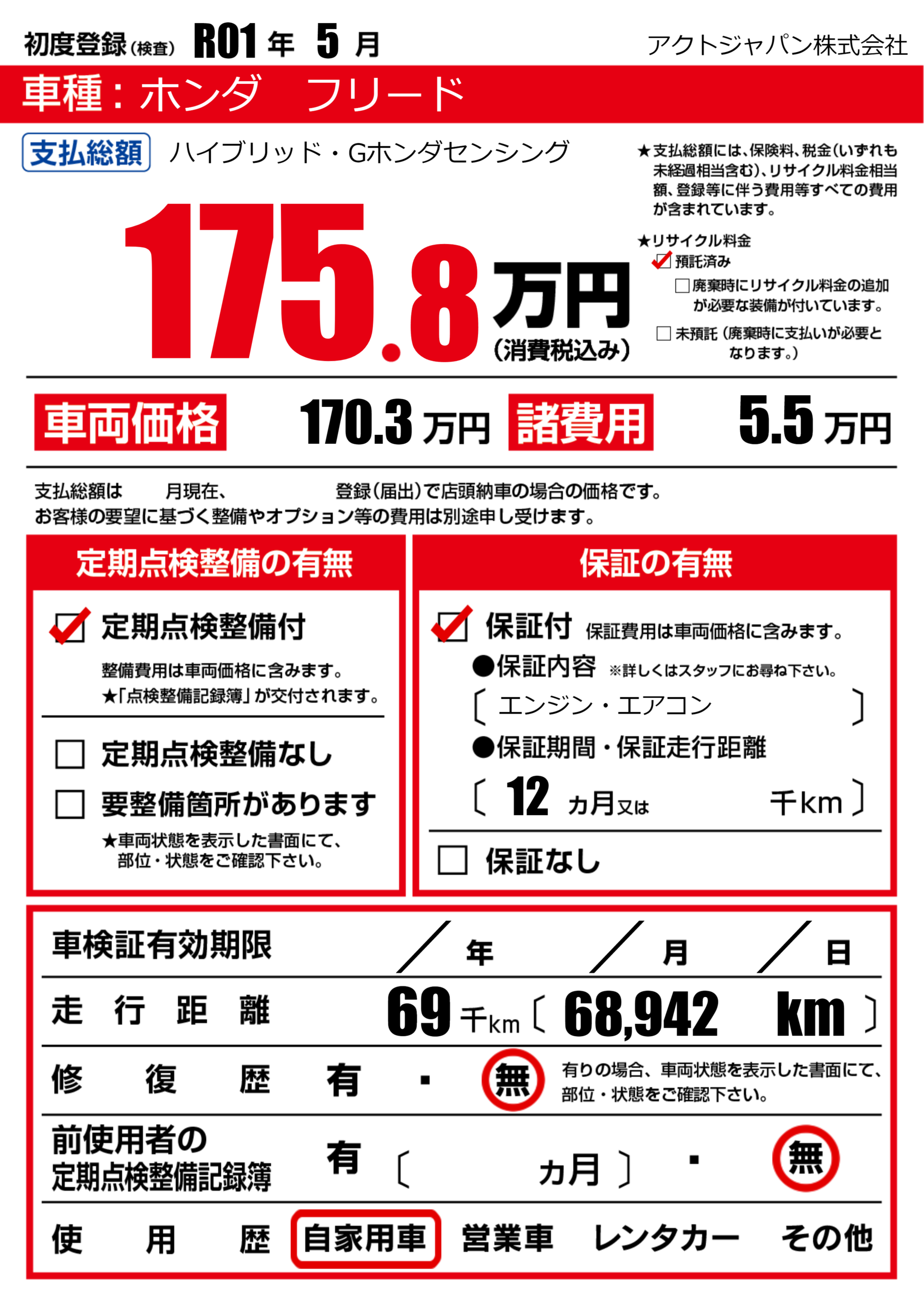 | 車名 | ホンダ フリード | グレード ミッション 排気量 |