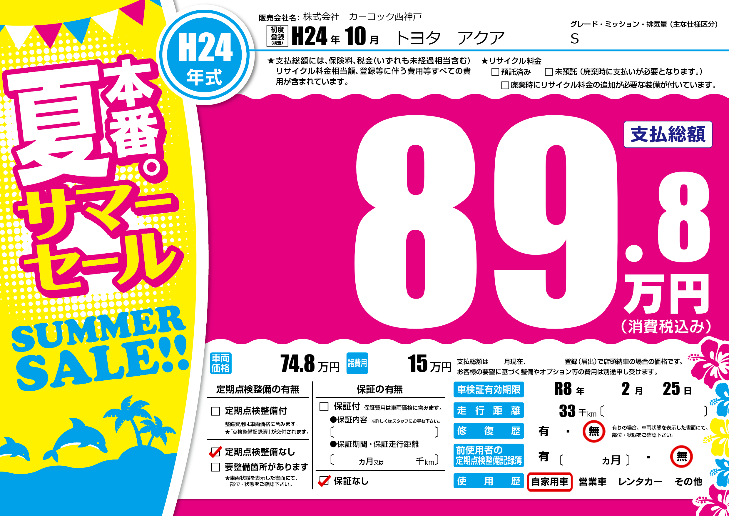 | 走行キロ | 3.3万km | 初年度登録 | H24年10月 |