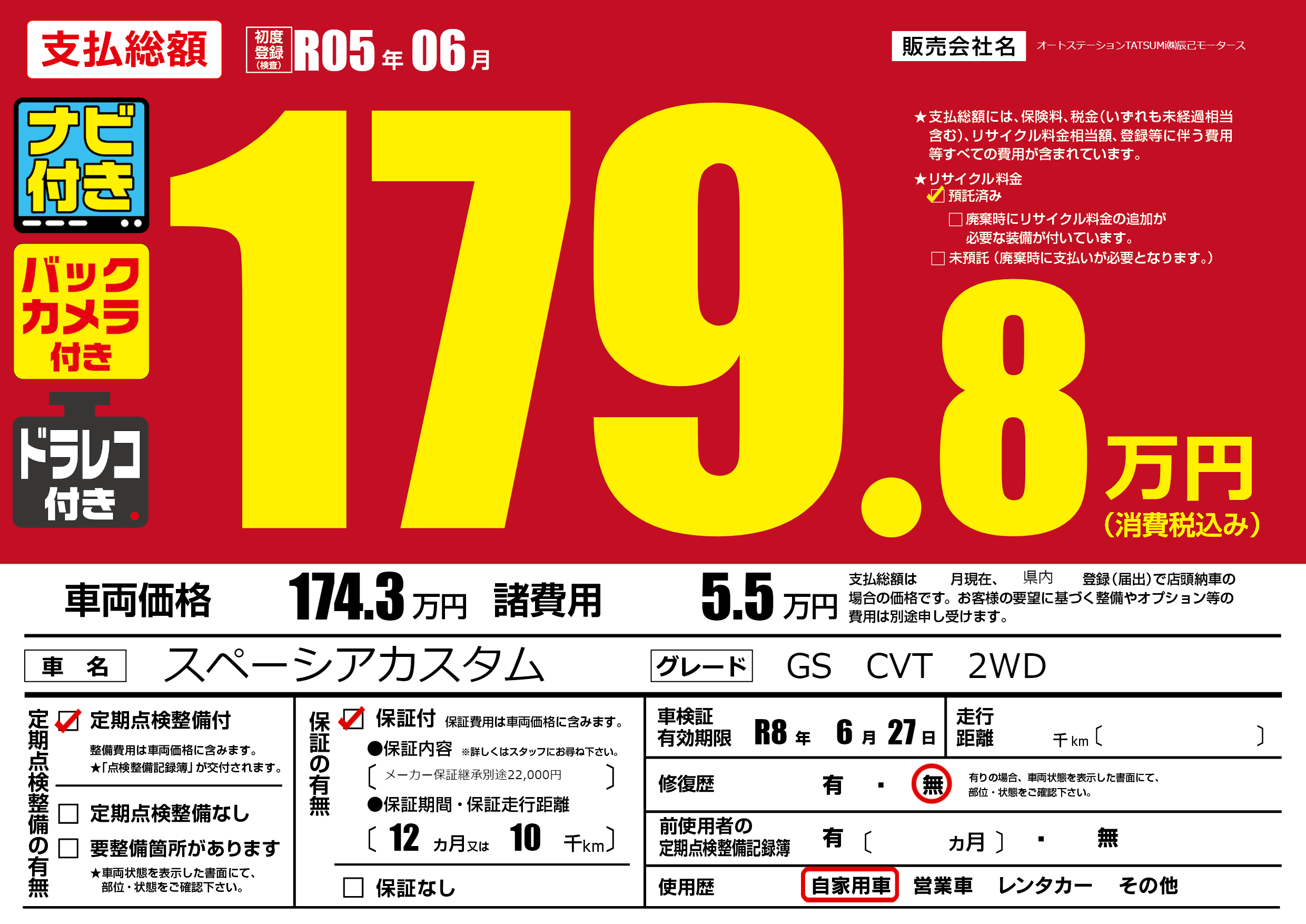 | 車名 | スペーシアカスタム | グレード ミッション 排気量 |