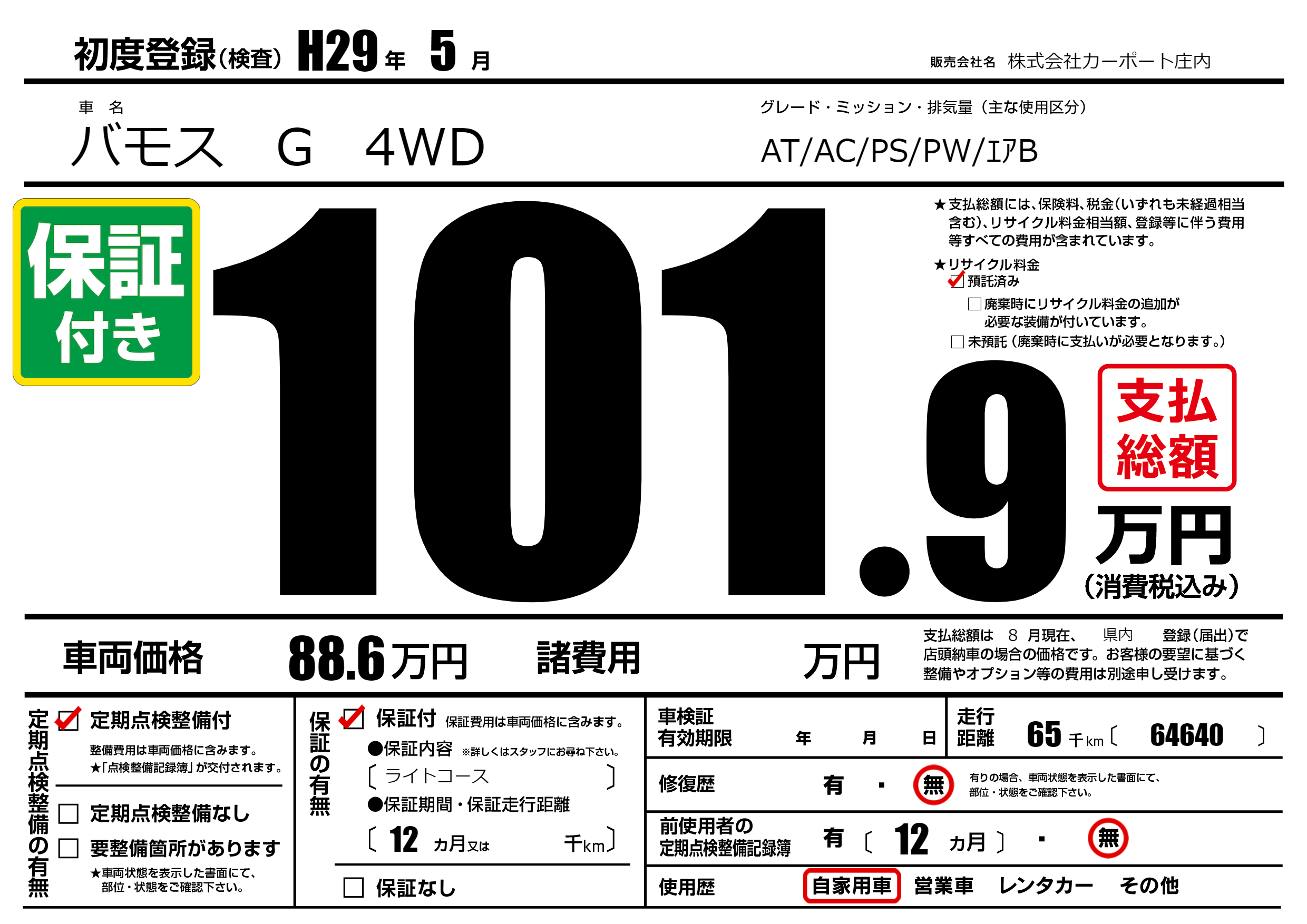 | 車名 | バモス G 4WD | グレード ミッション 排気量 |