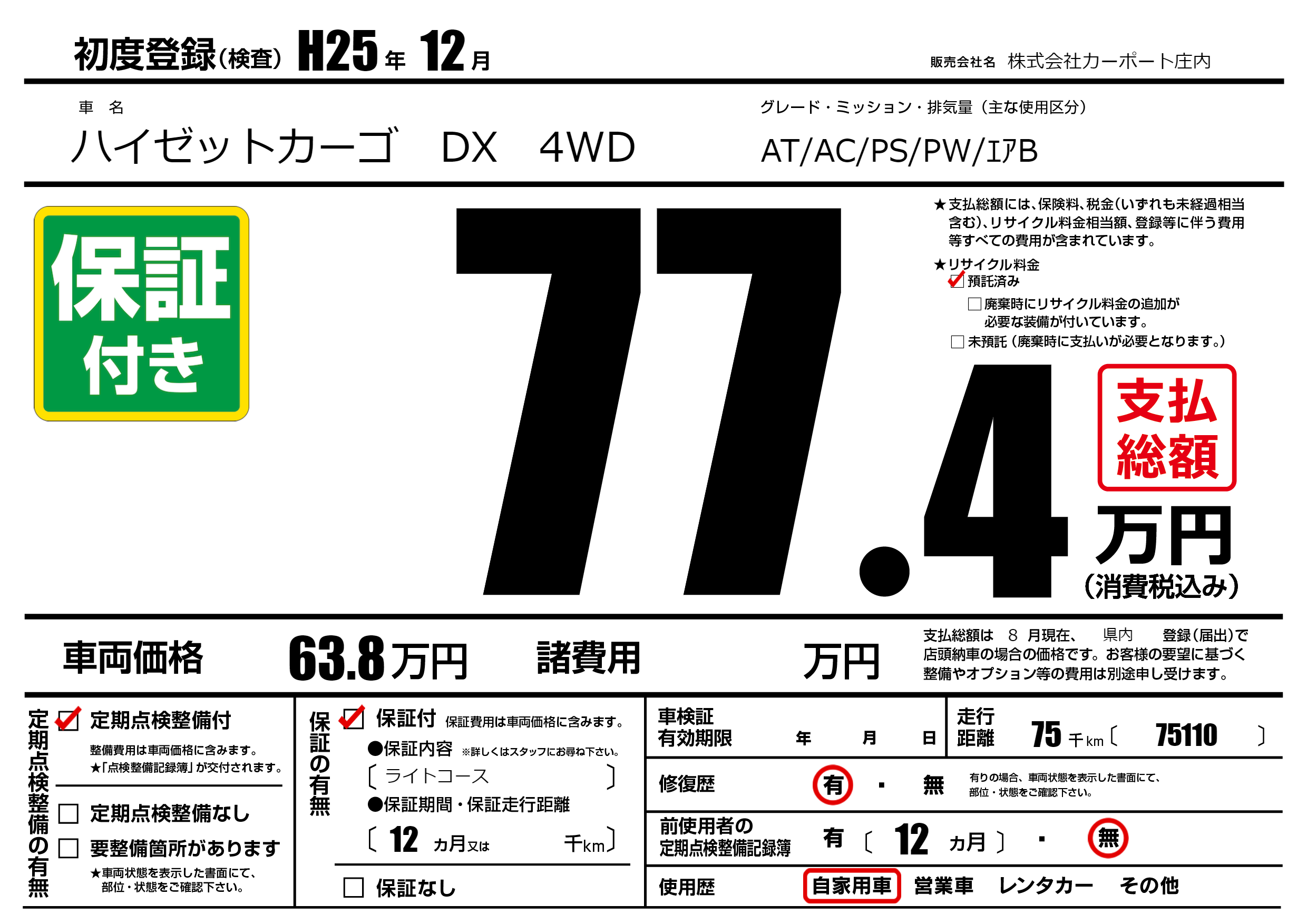 | 車名 | ハイゼットカーゴ DX 4WD | グレード ミッション 排気量 |