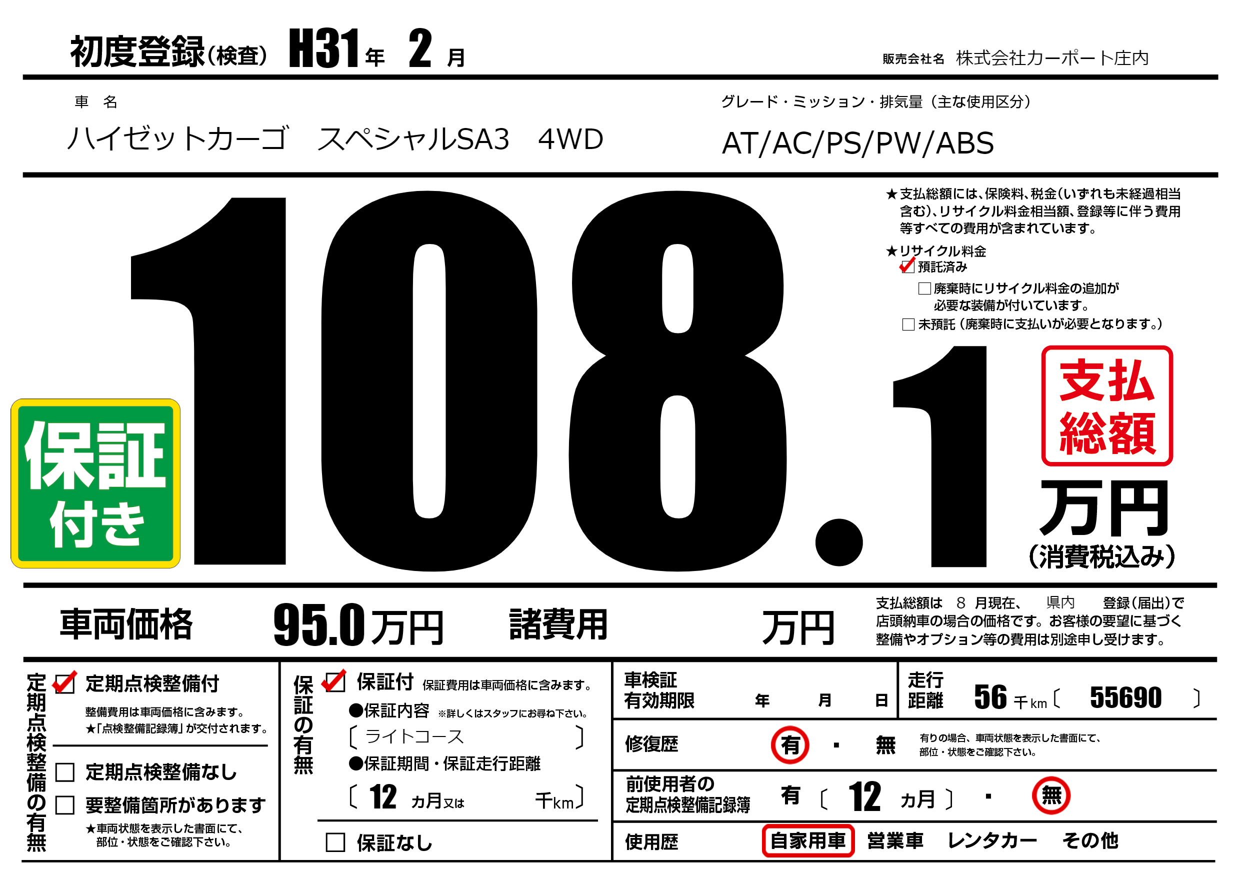 | 車名 | ハイゼットカーゴ スペシャルSA3 4WD | グレード ミッション 排気量 |