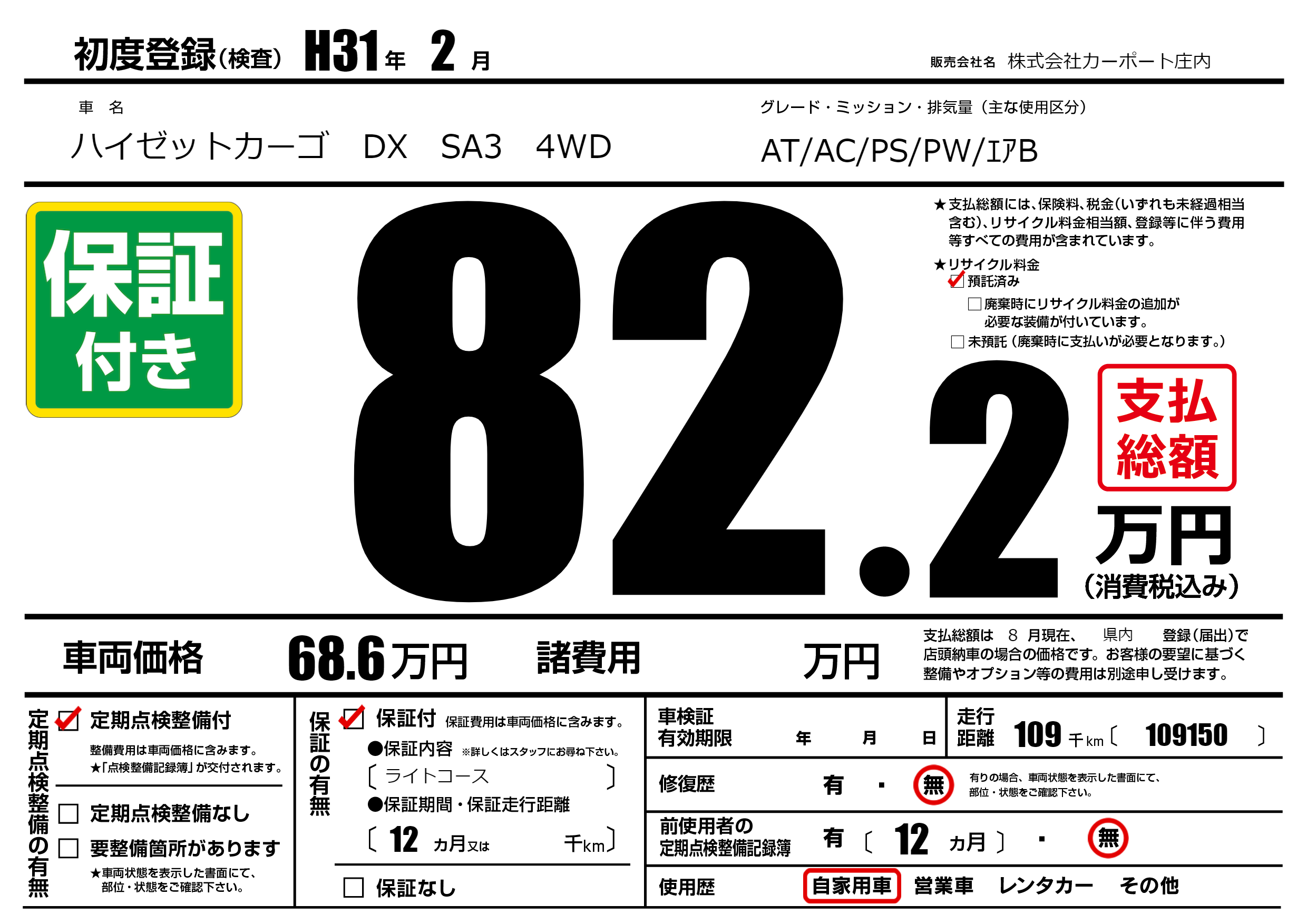 | 車名 | ハイゼットカーゴ DX SA3 4WD | グレード ミッション 排気量 |