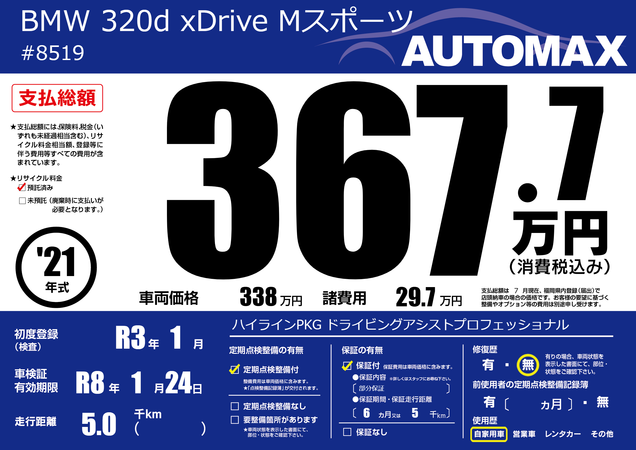 | 車名 | BMW 320d xDrive Mスポーツ | グレード ミッション 排気量 |