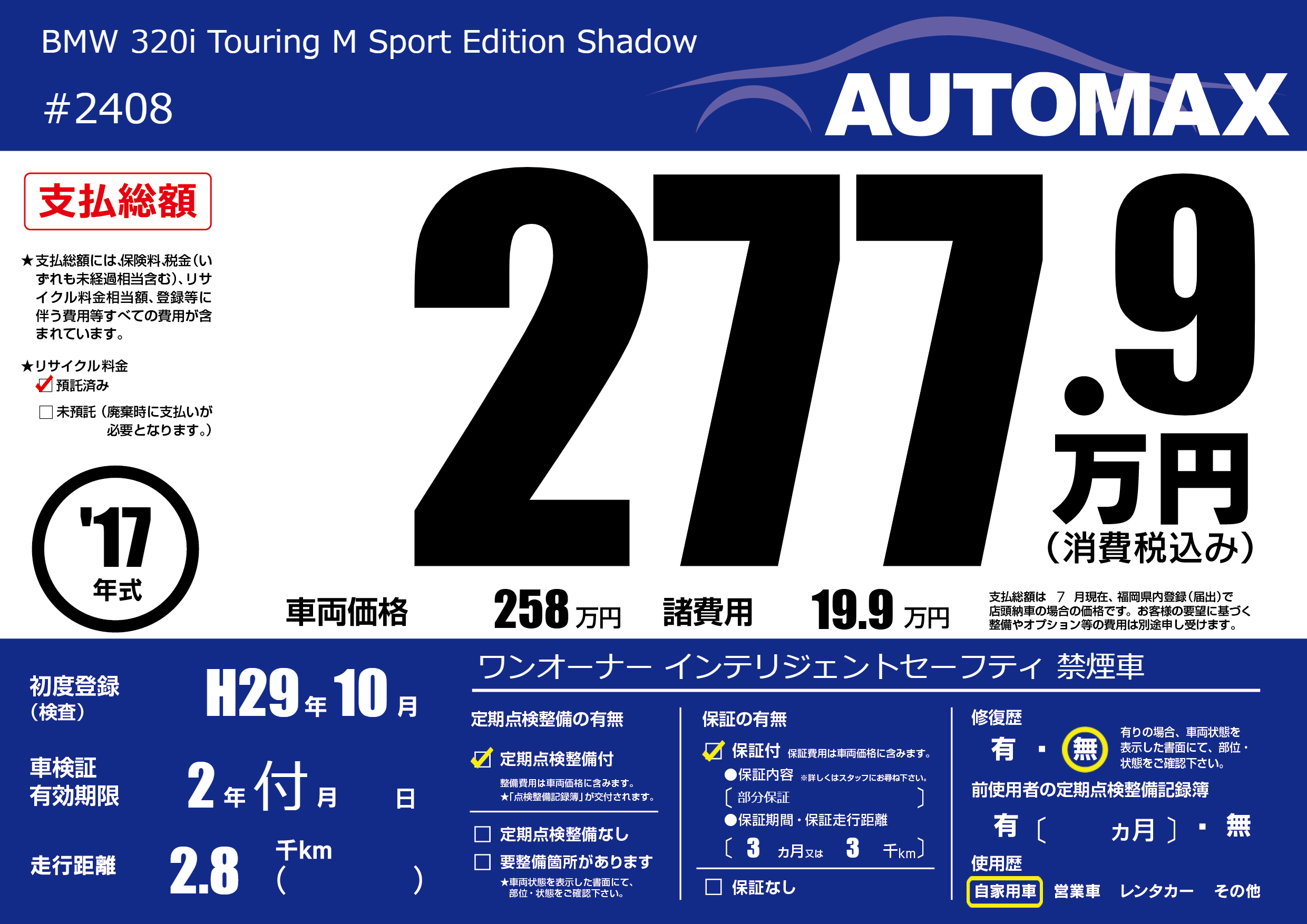 | 車名 | BMW 320i Touring M Sport Edition Shadow | グレード ミッション 排気量 |