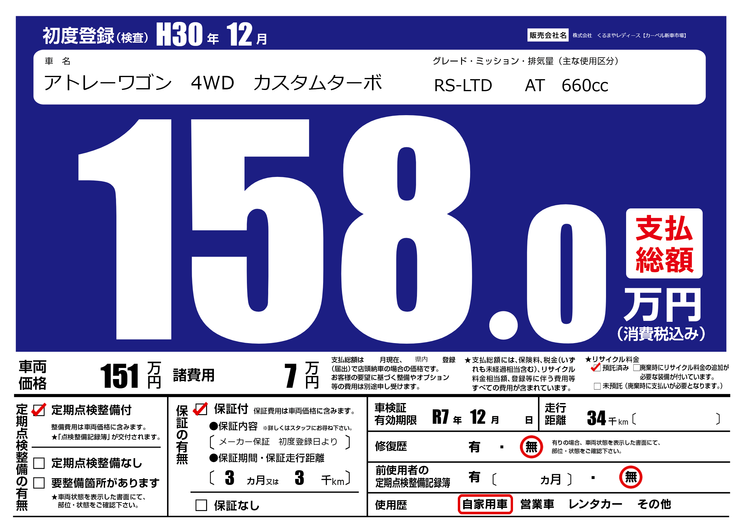 | 走行キロ | 3.4万km | 初年度登録 | H30年12月 |