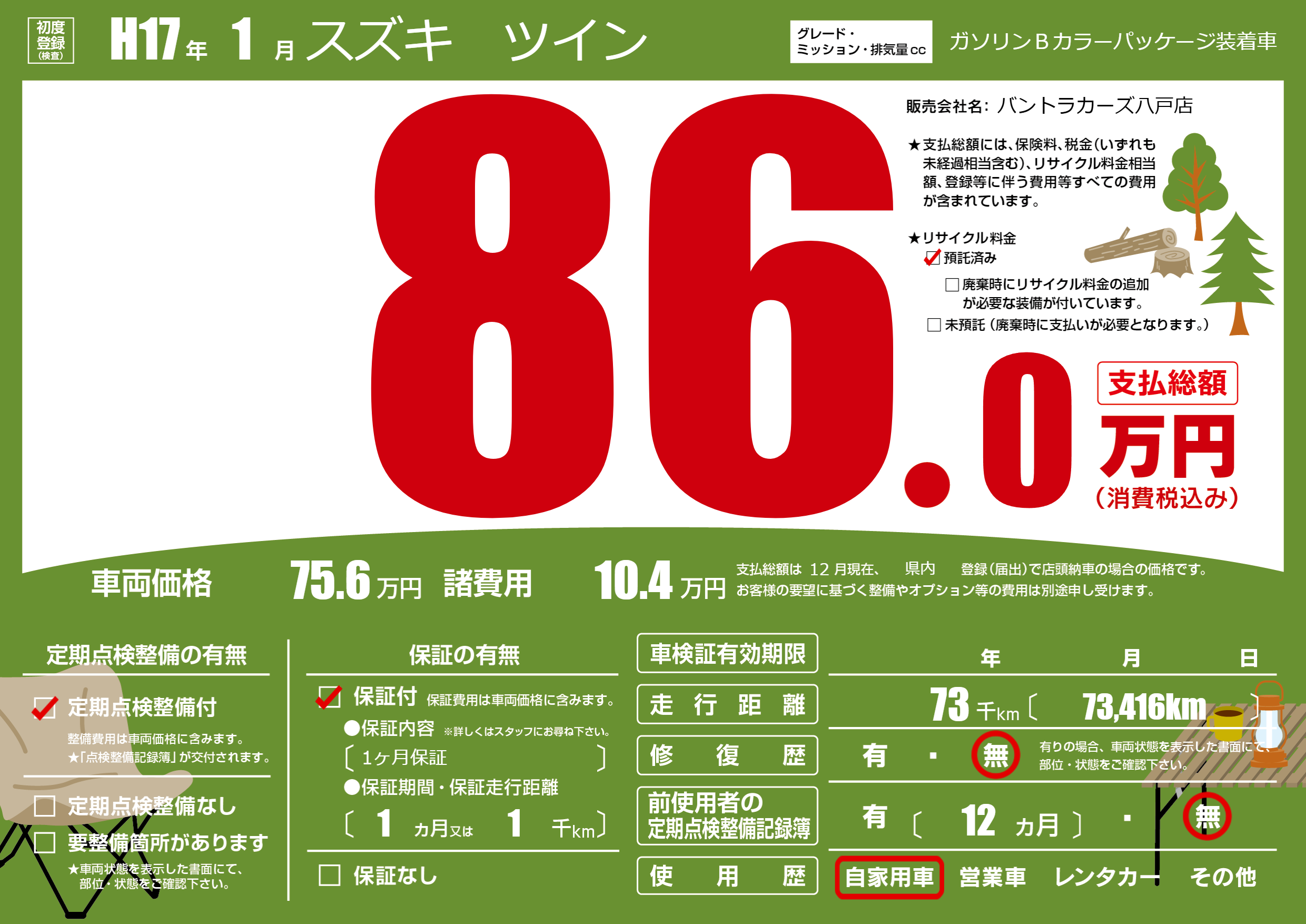 | 走行キロ | 7.3万km | 初年度登録 | H17年1月 |