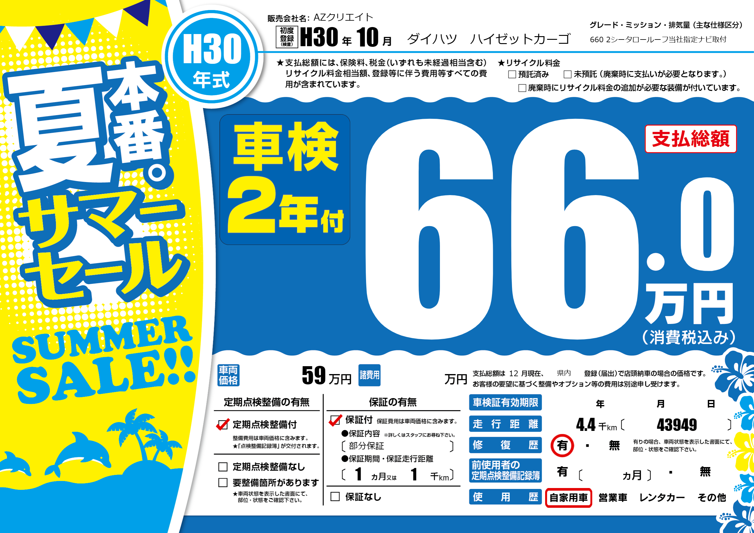 | 走行キロ | 0.4万km | 初年度登録 | H30年10月 |