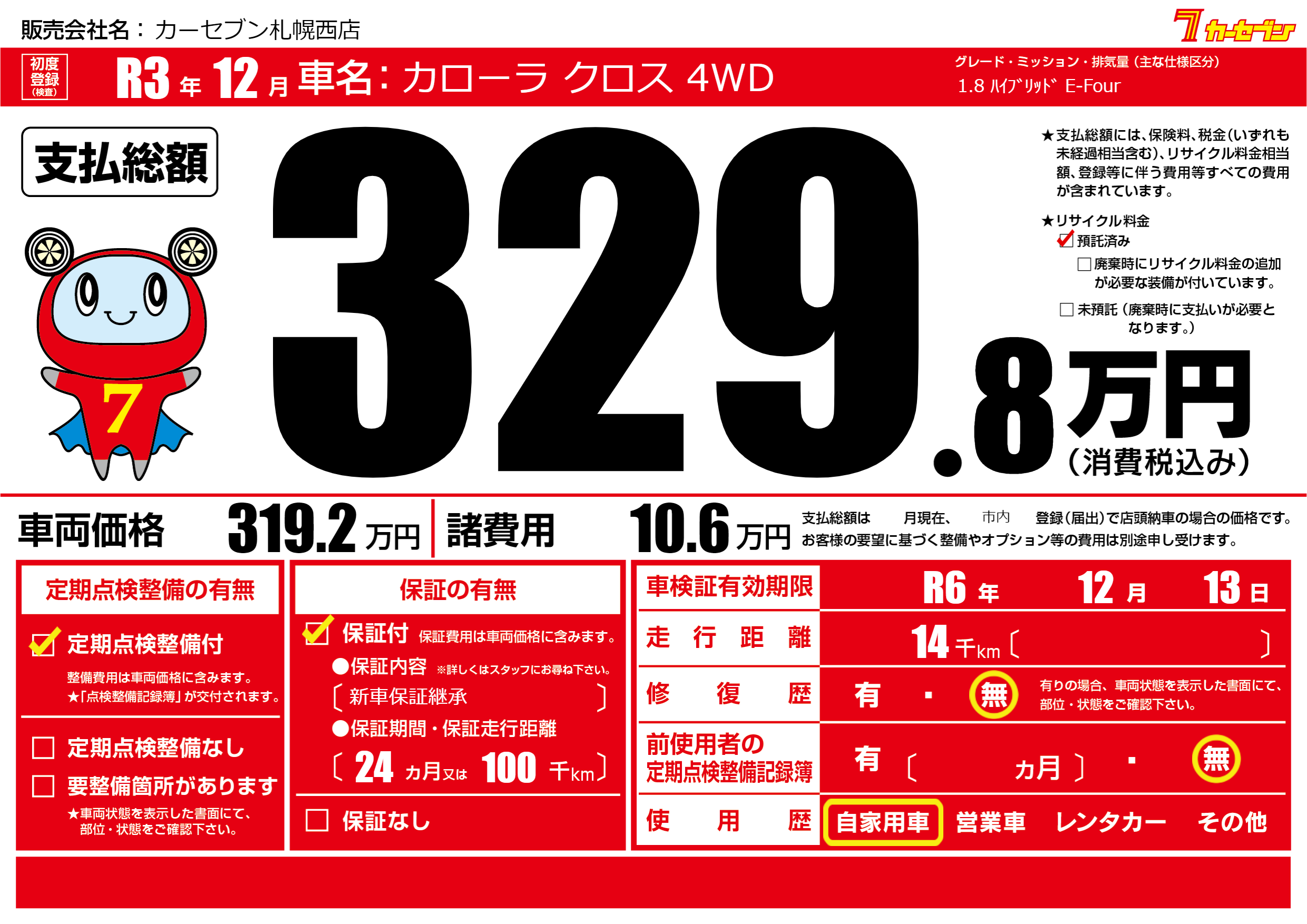 | 走行キロ | 1.4万km | 初年度登録 | R3年12月 |