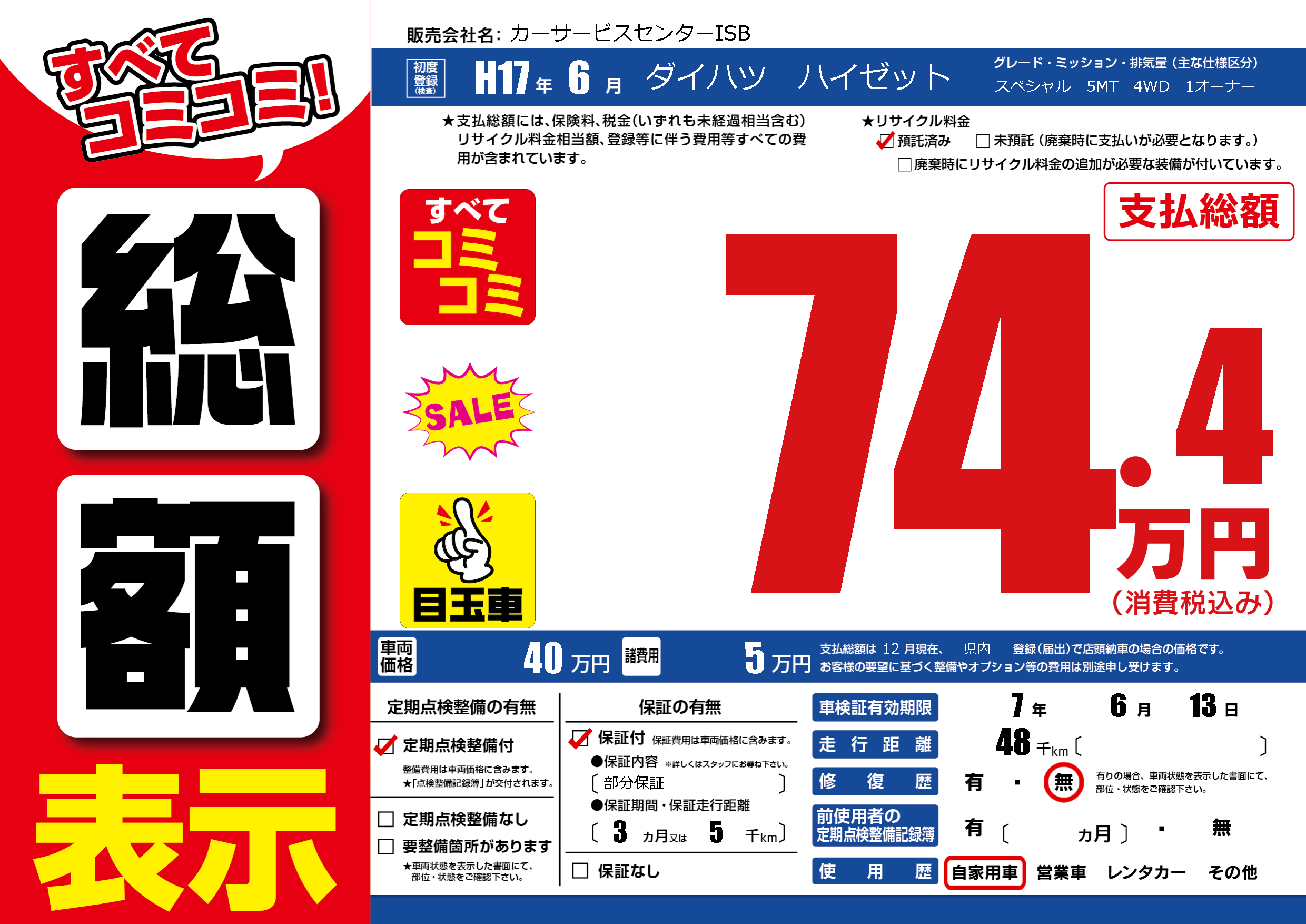 | 走行キロ | 4.8万km | 初年度登録 | H17年6月 |