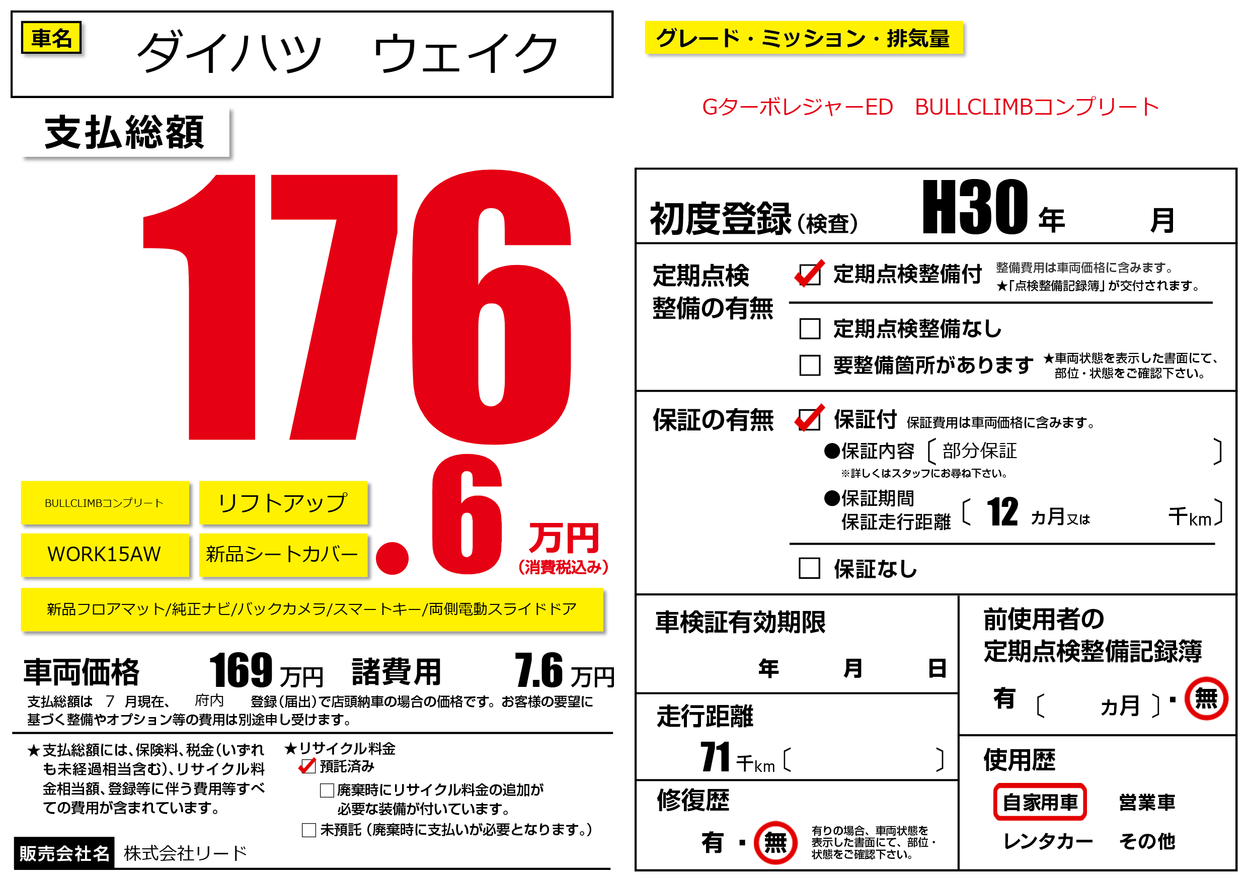| 車名 | ダイハツ ウェイク | グレード ミッション 排気量 |