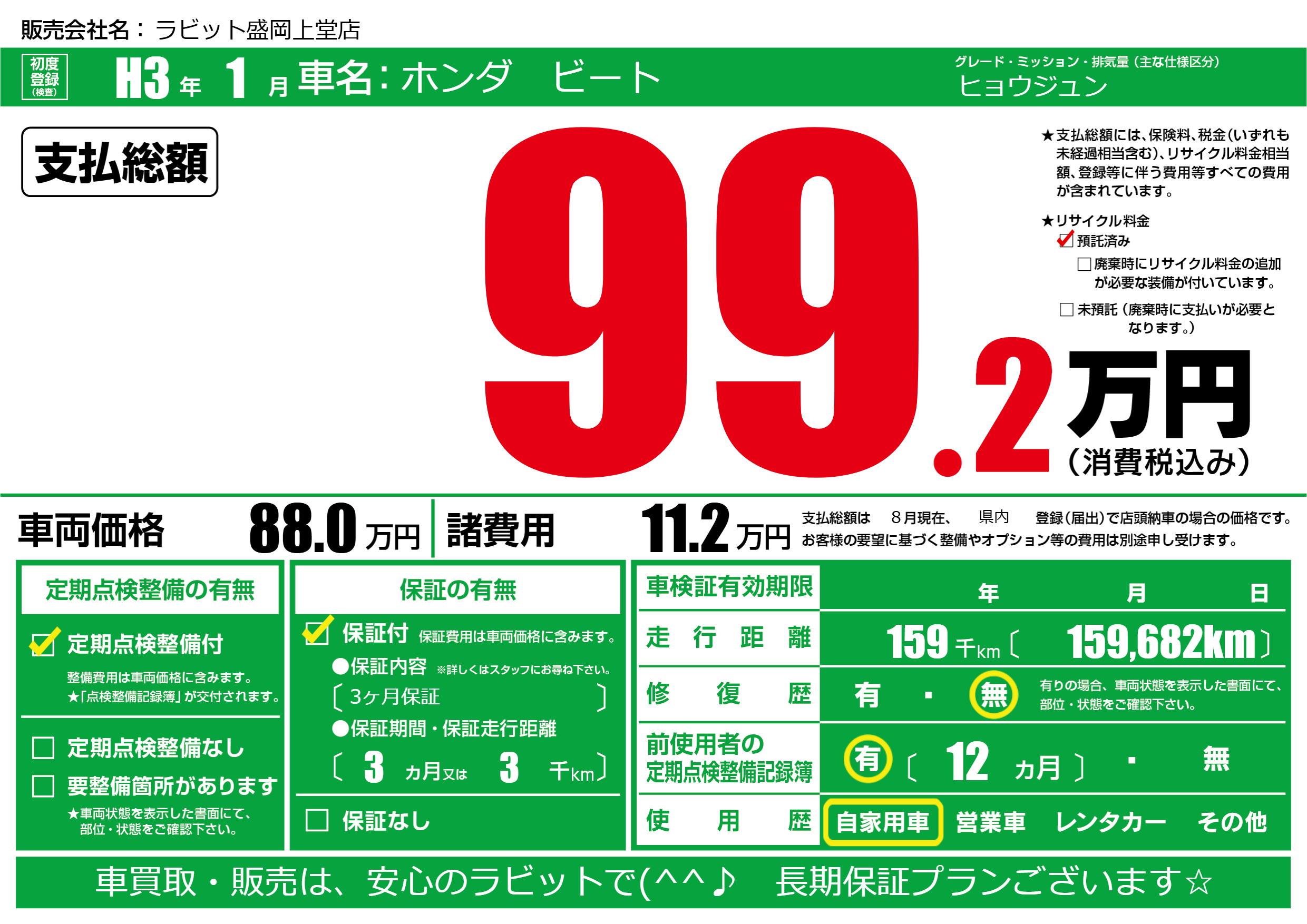 | 走行キロ | 15.9万km | 初年度登録 | H3年1月 |