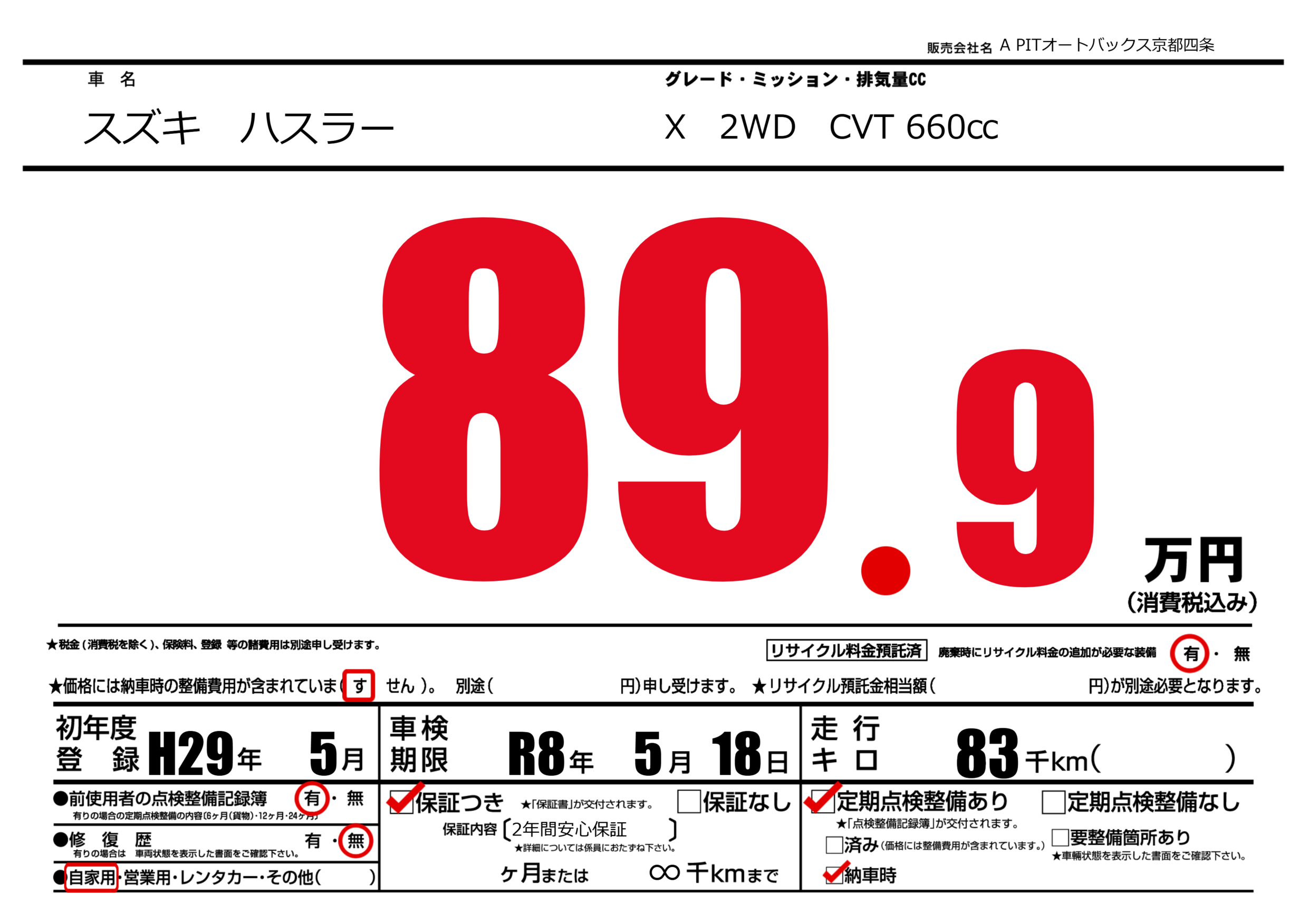 | 車名 | スズキ ハスラー | グレード ミッション 排気量 |
