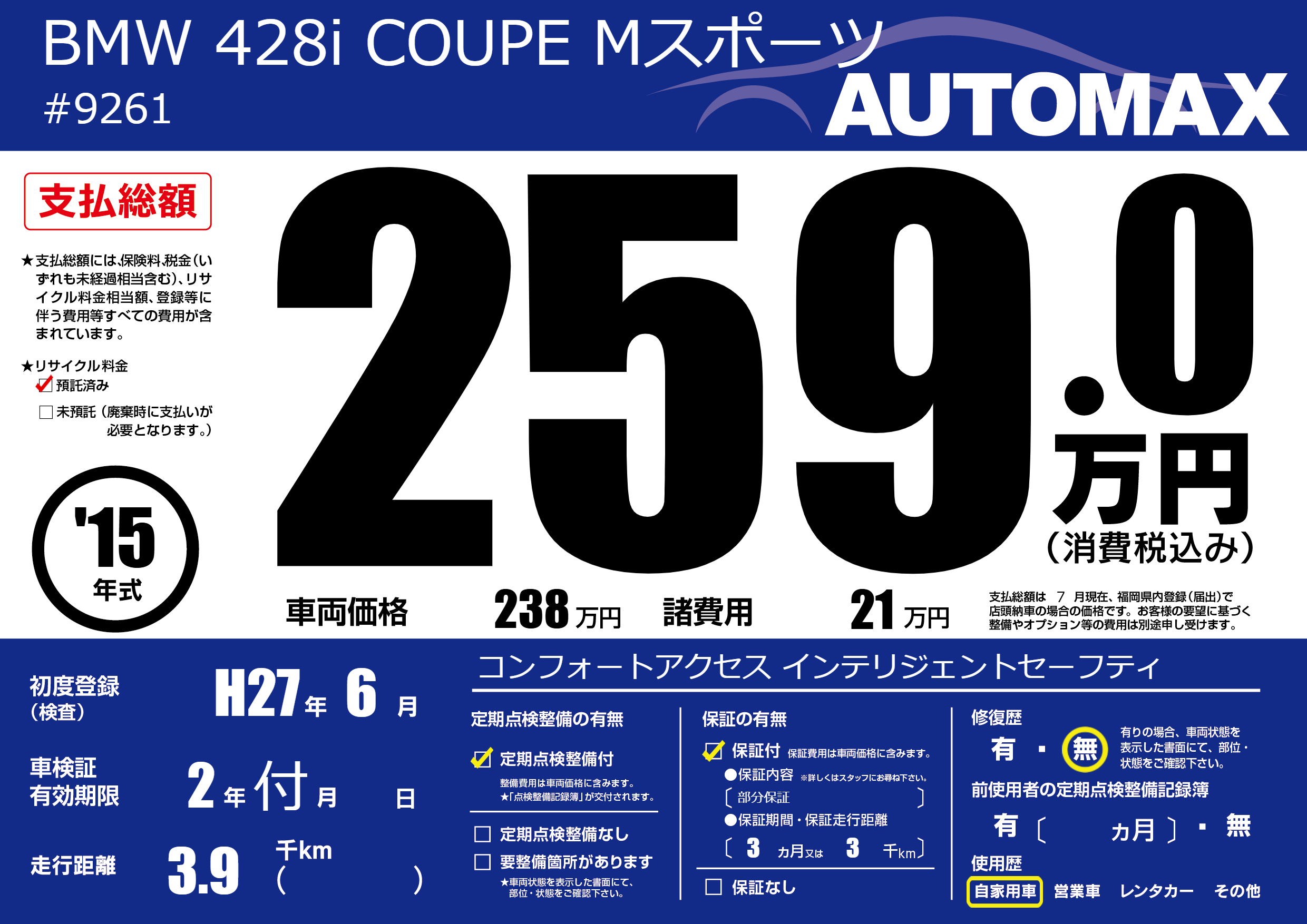 | 車名 | BMW 428i COUPE Mスポーツ | グレード ミッション 排気量 |