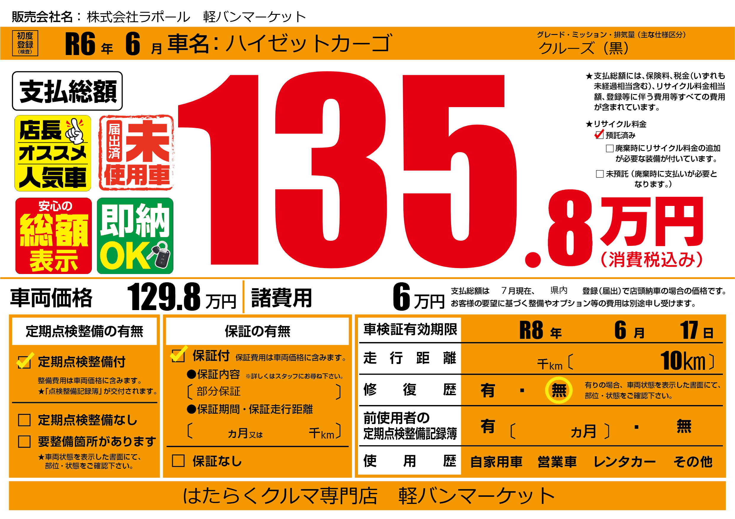 | 走行キロ | - | 初年度登録 | R6年6月 |