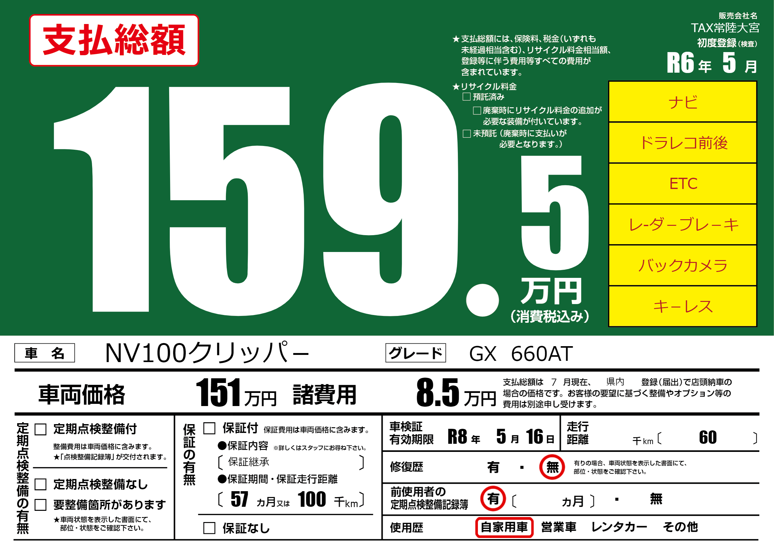 保証なし 保証内容(保証継承) 57ヶ月または(100)千kmまで |