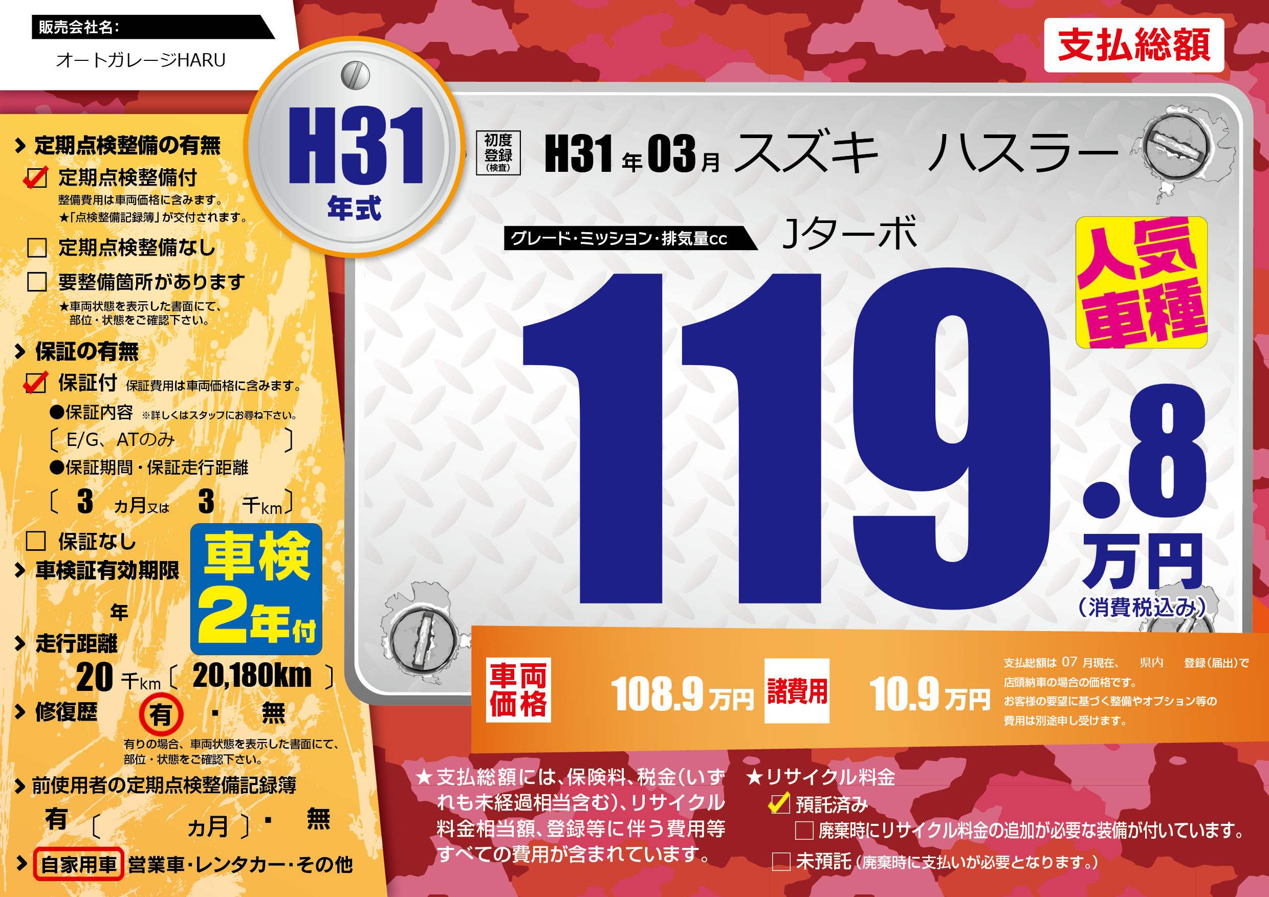| 走行キロ | 2万km | 初年度登録 | H31年03月 |