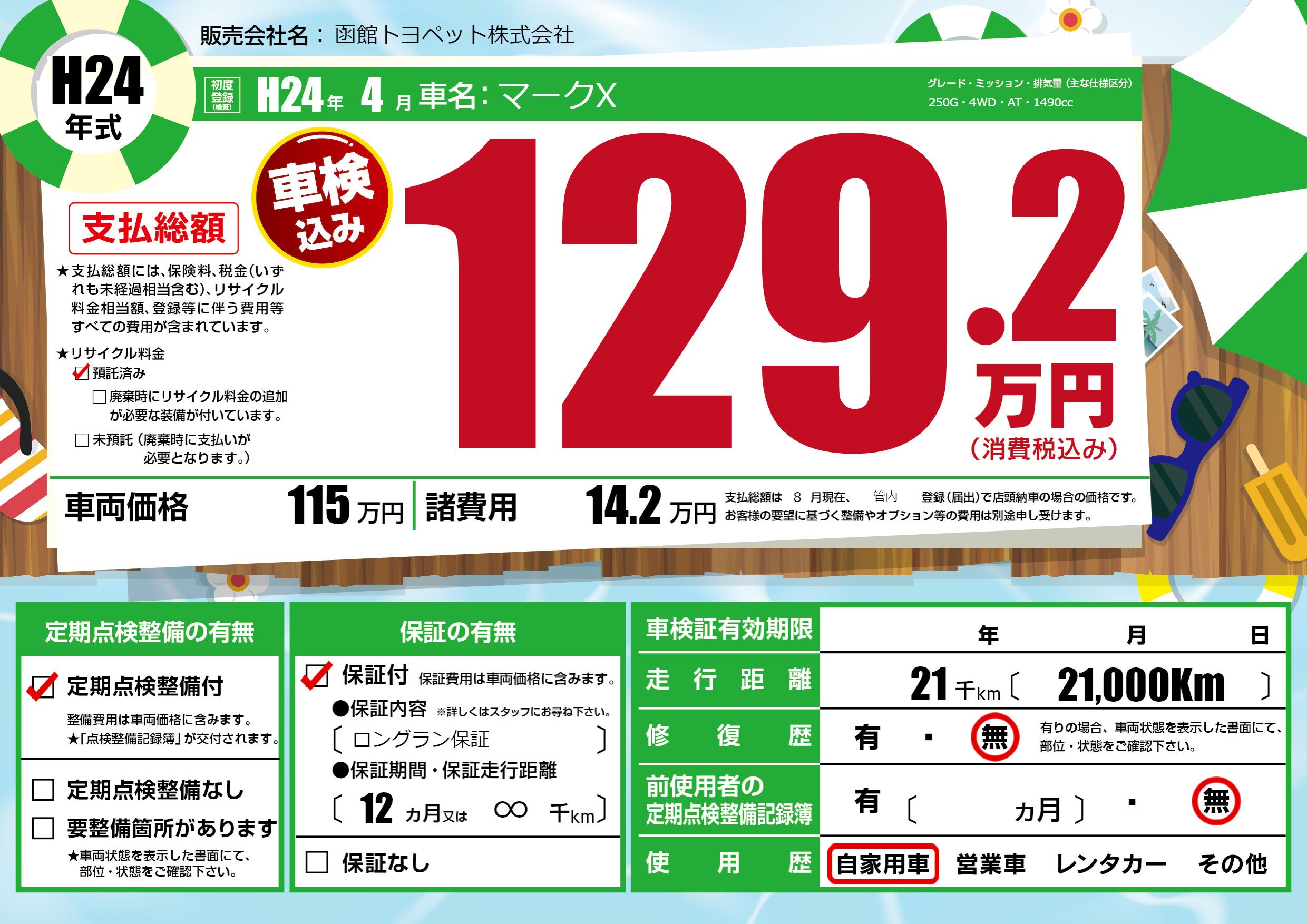 | 走行キロ | 2.1万km | 初年度登録 | H24年4月 |