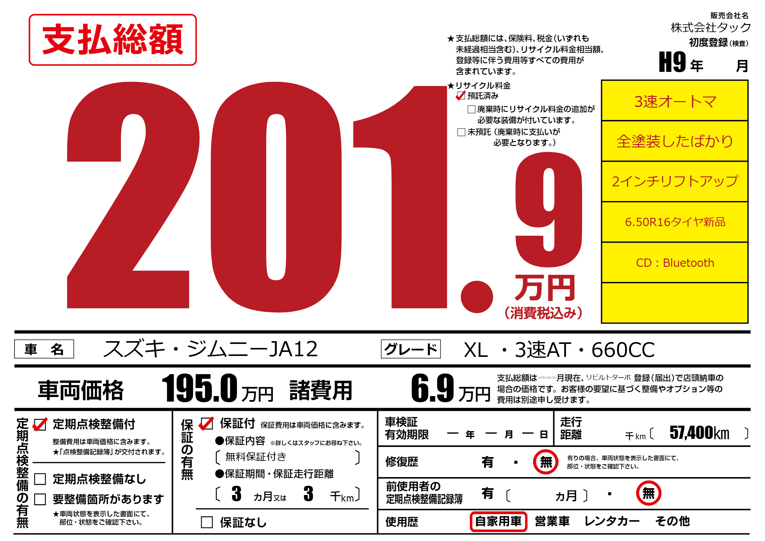 保証なし 保証内容(無料保証付き) 3ヶ月または(3)千kmまで |