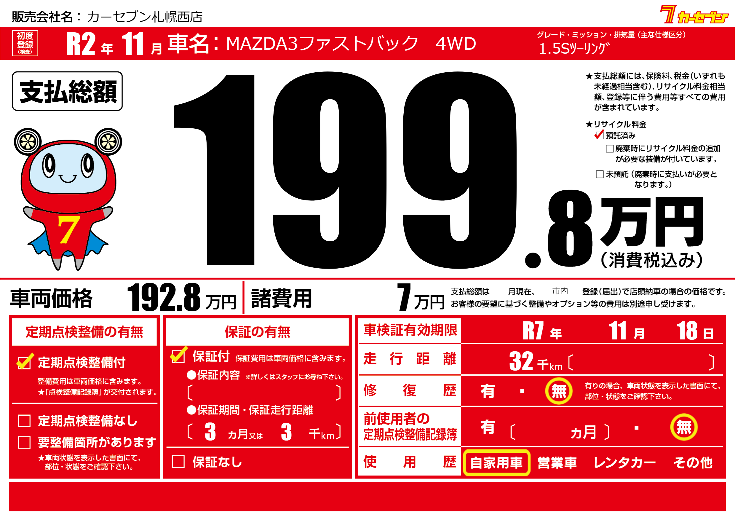 | 車名 | MAZDA3ファストバック 4WD | グレード ミッション 排気量 |