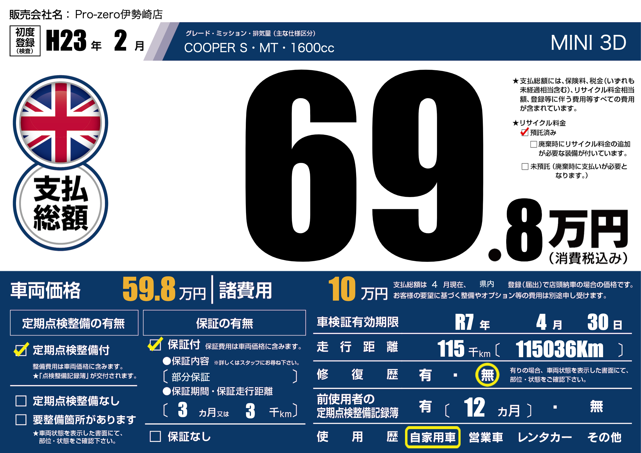 | 車名 | MINI 3D | グレード ミッション 排気量 |