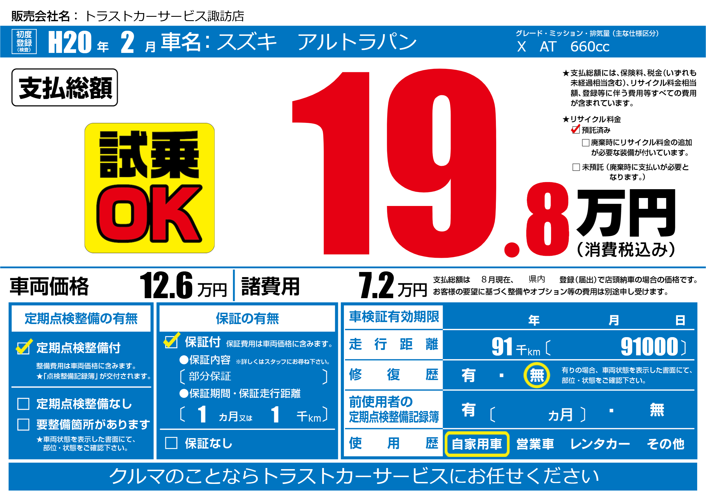 | 走行キロ | 9.1万km | 初年度登録 | H20年2月 |