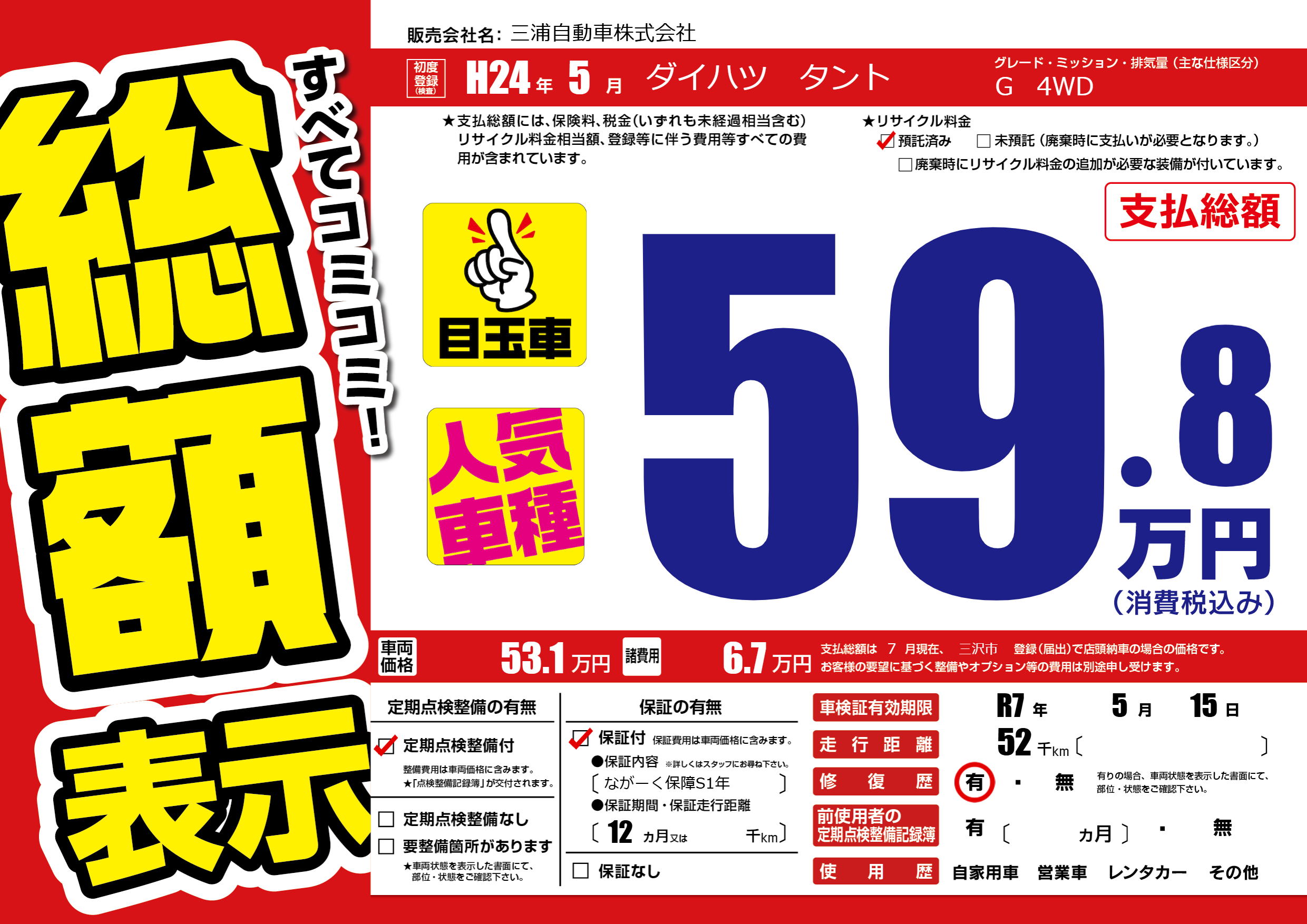 | 車名 | ダイハツ タント | グレード ミッション 排気量 |