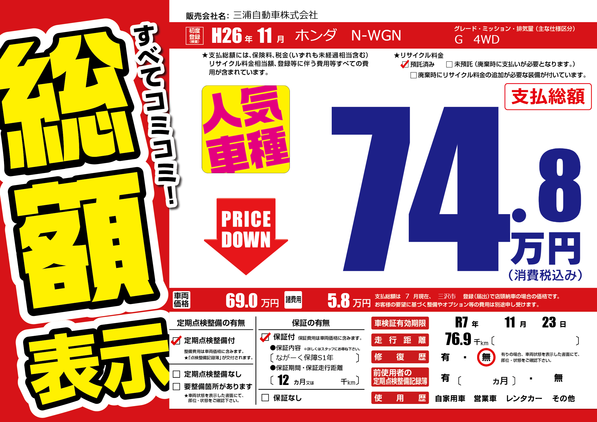 | 車名 | ホンダ N-WGN | グレード ミッション 排気量 |
