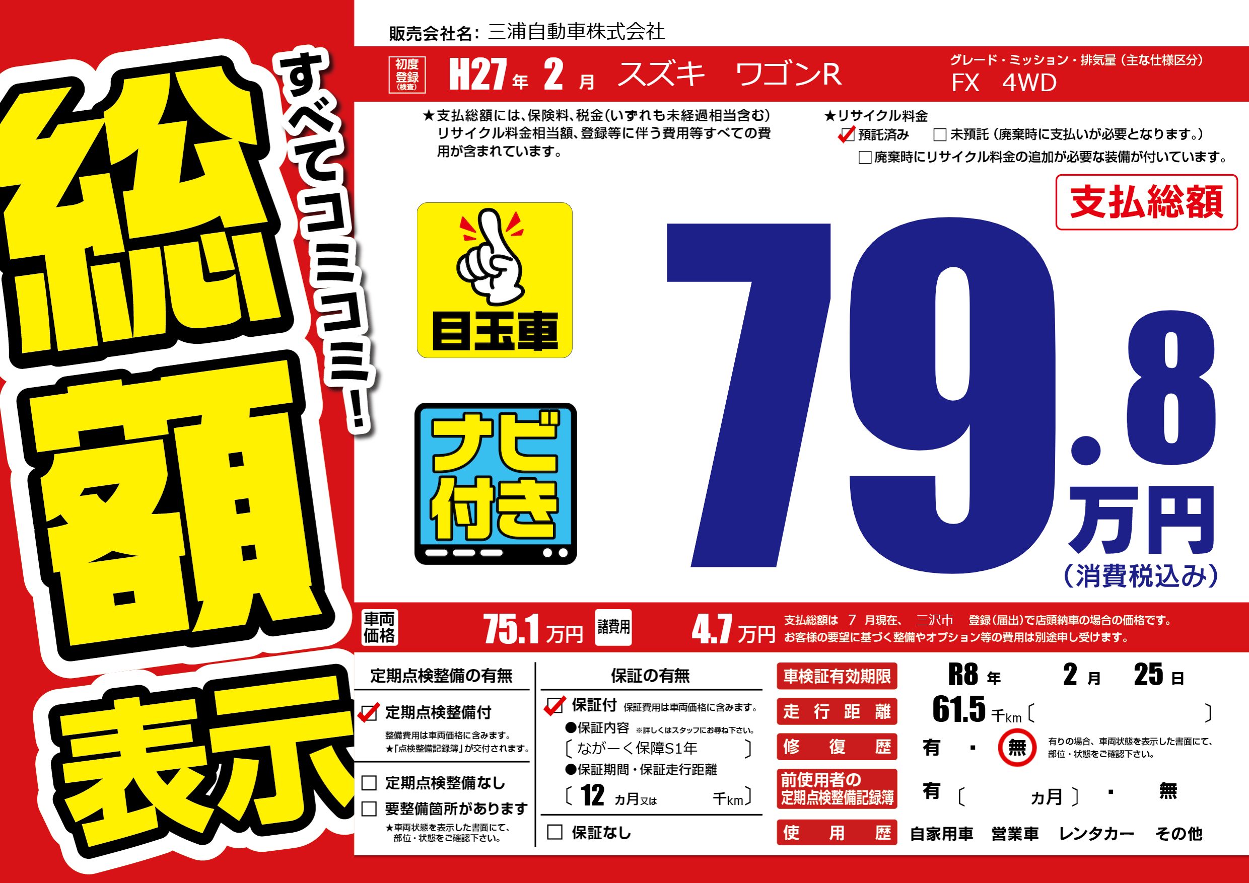 | 車名 | スズキ ワゴンR | グレード ミッション 排気量 |
