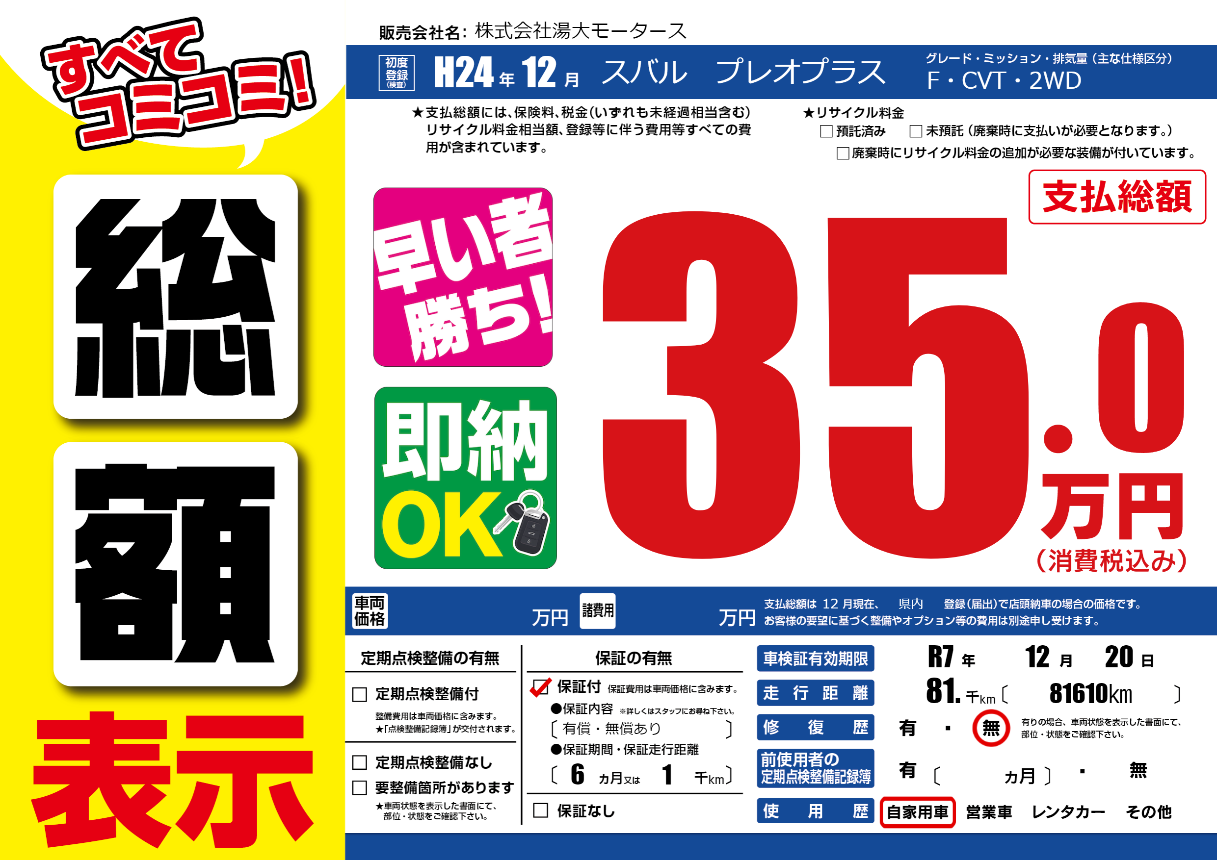 | 車名 | スバル プレオプラス | グレード ミッション 排気量 |