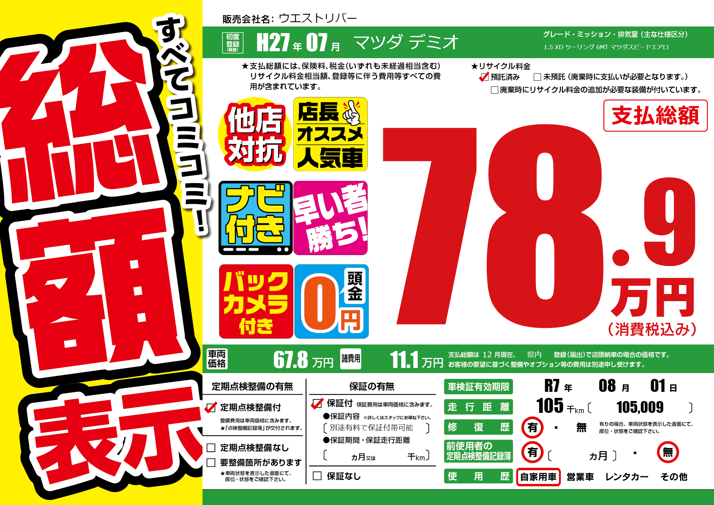 | 車名 | マツダ デミオ | グレード ミッション 排気量 |