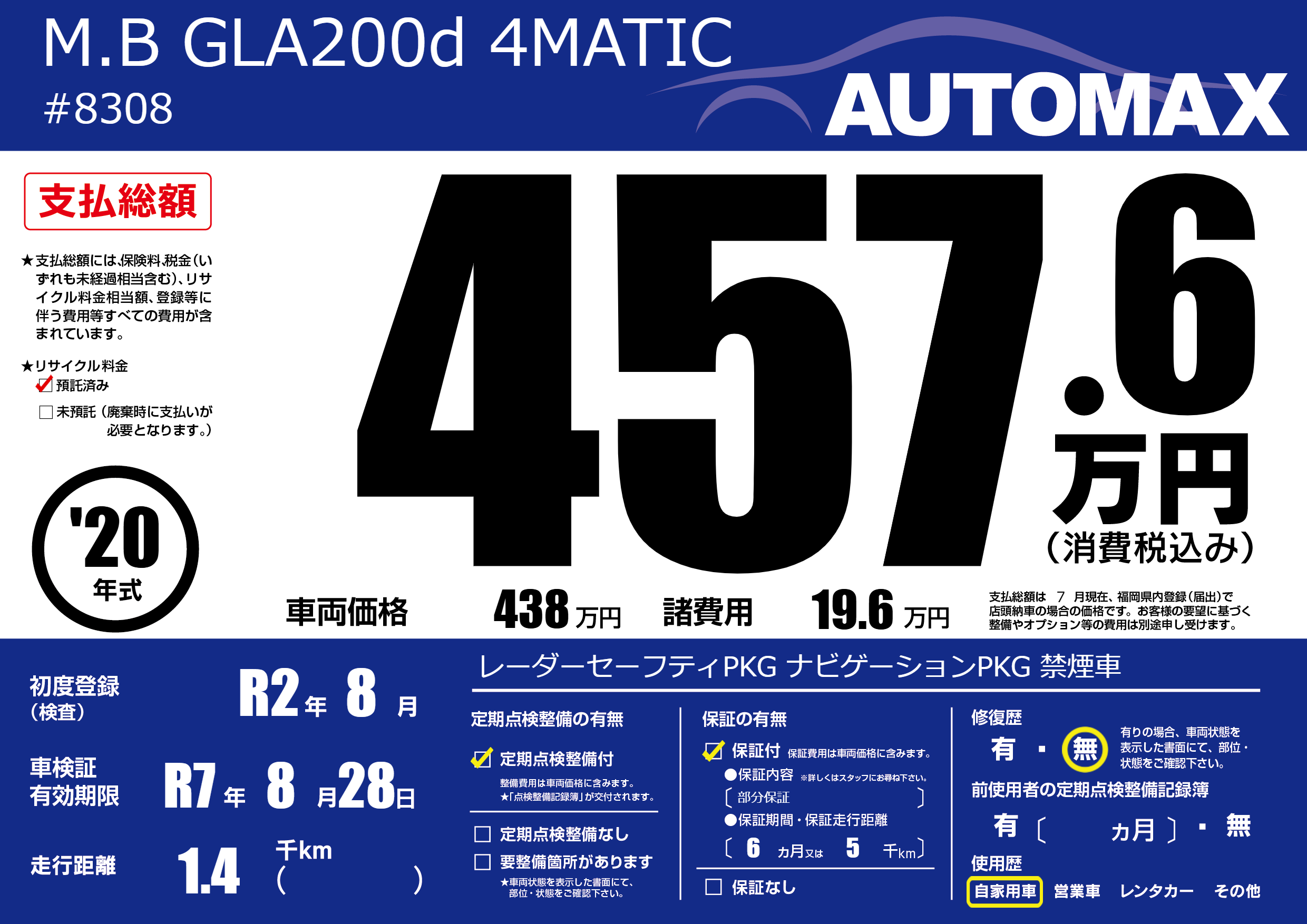 | 車名 | M.B GLA200d 4MATIC | グレード ミッション 排気量 |