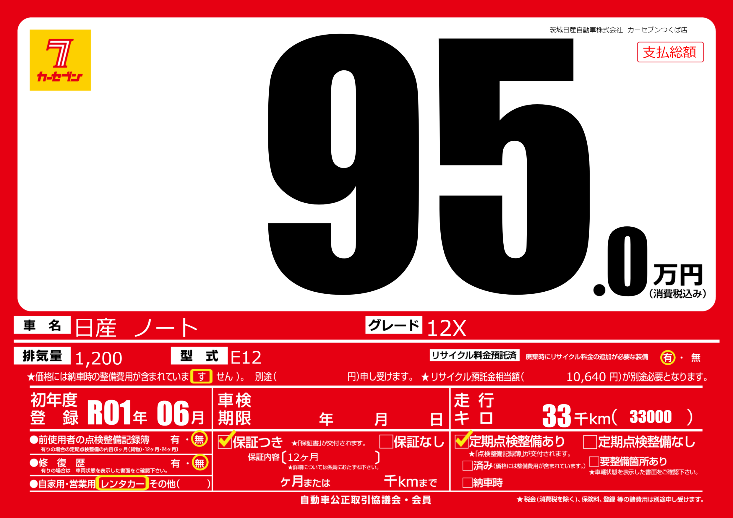 保証付き 保証内容(12ヶ月) ---ヶ月または()千kmまで |