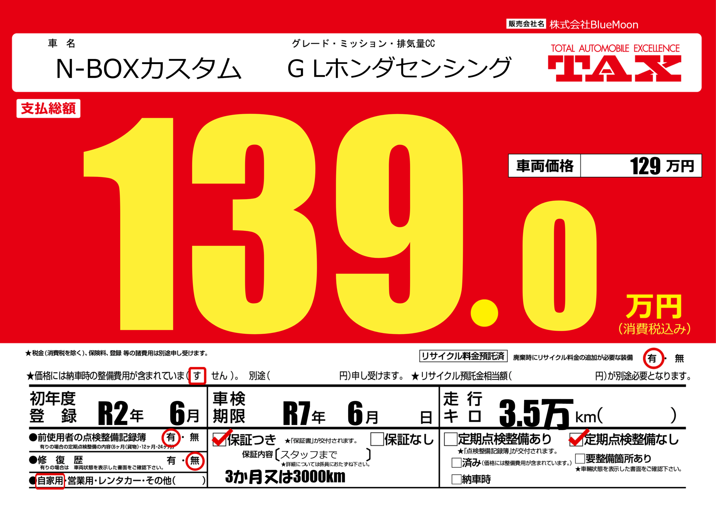 | 車名 | N-BOXカスタム | グレード ミッション 排気量 |