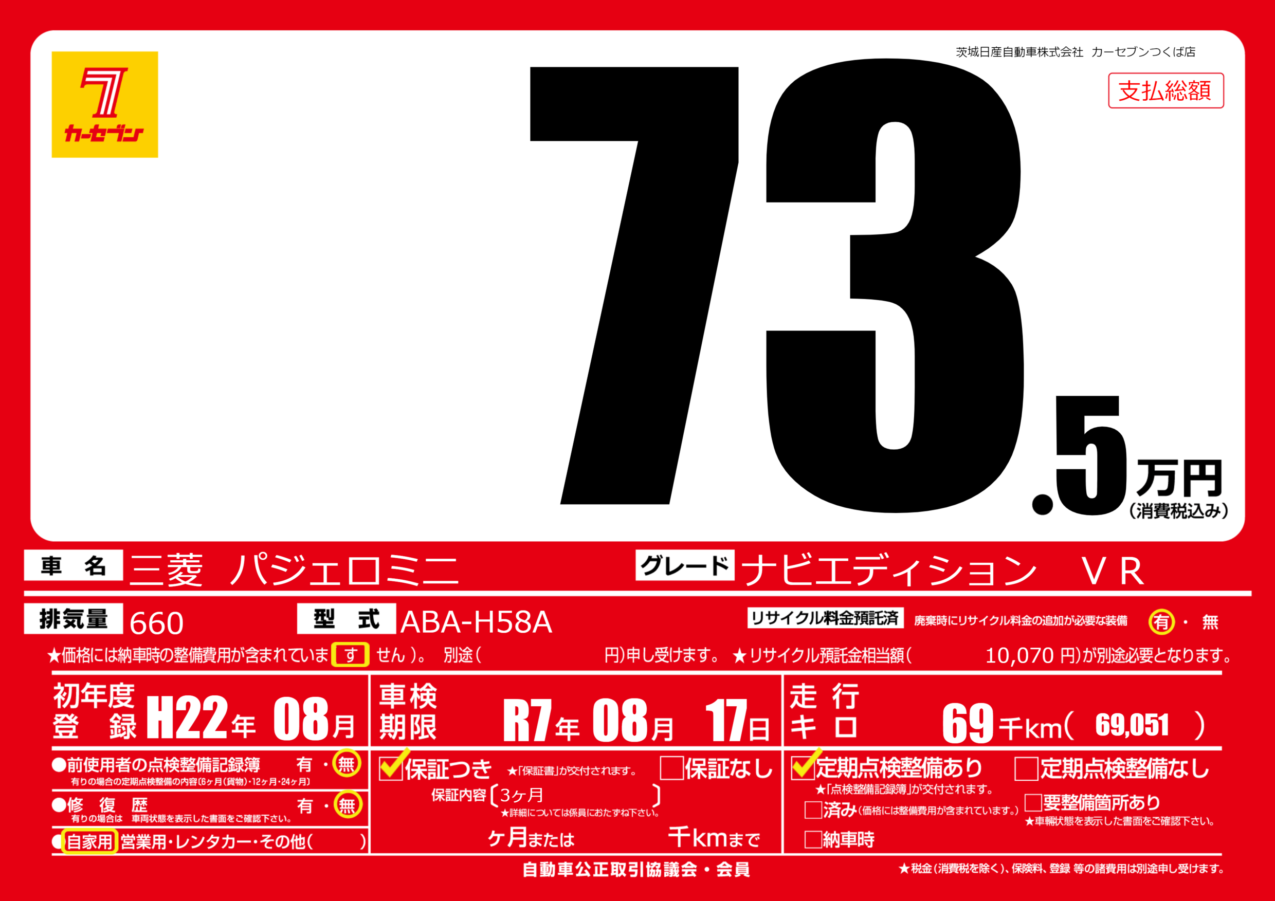 | 車名 | 三菱 パジェロミニ | グレード ミッション 排気量 |