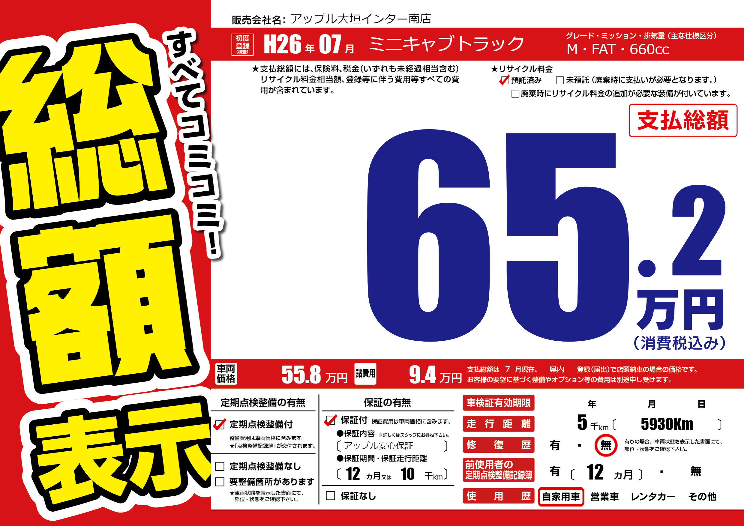 | 走行キロ | 0.5万km | 初年度登録 | H26年07月 |