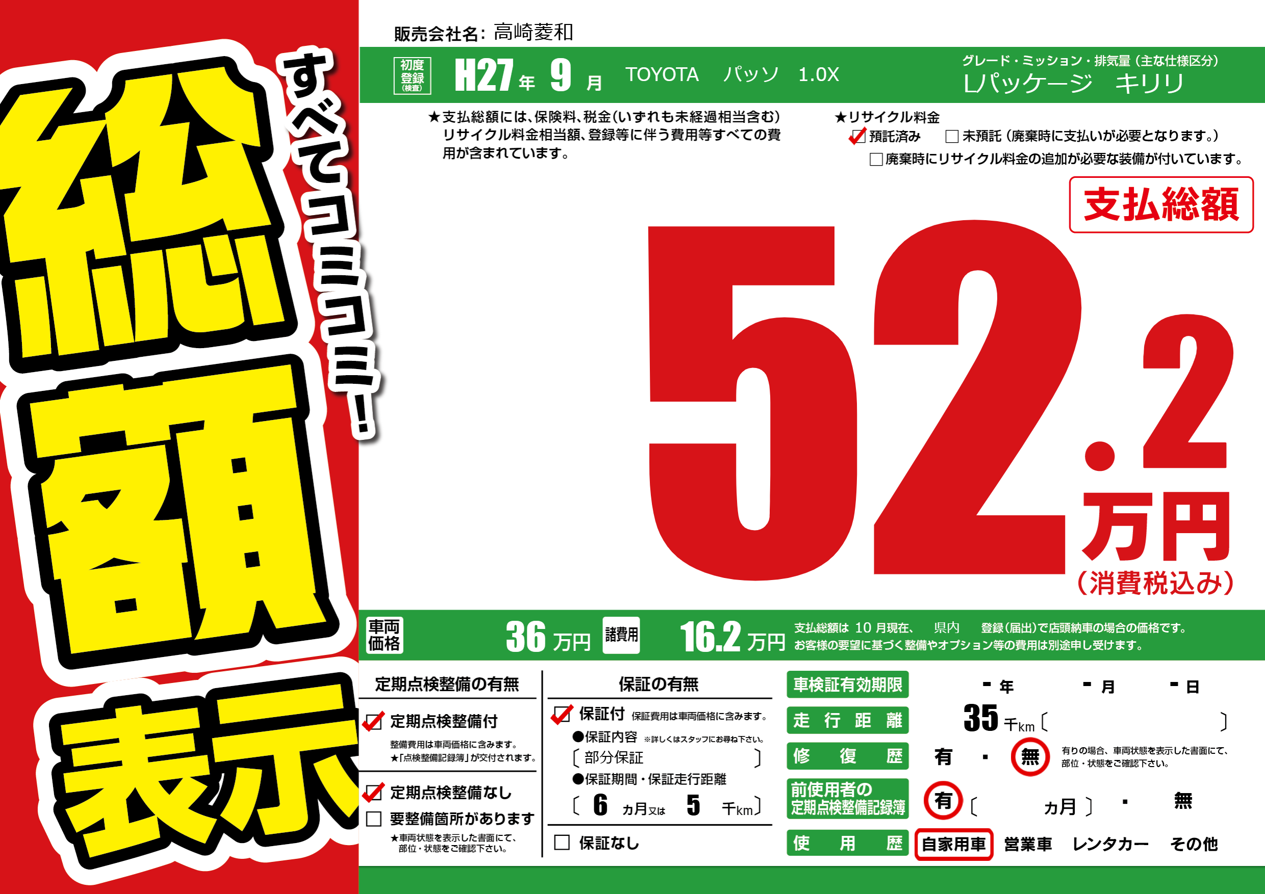 | 車名 | TOYOTA パッソ 1.0X | グレード ミッション 排気量 |