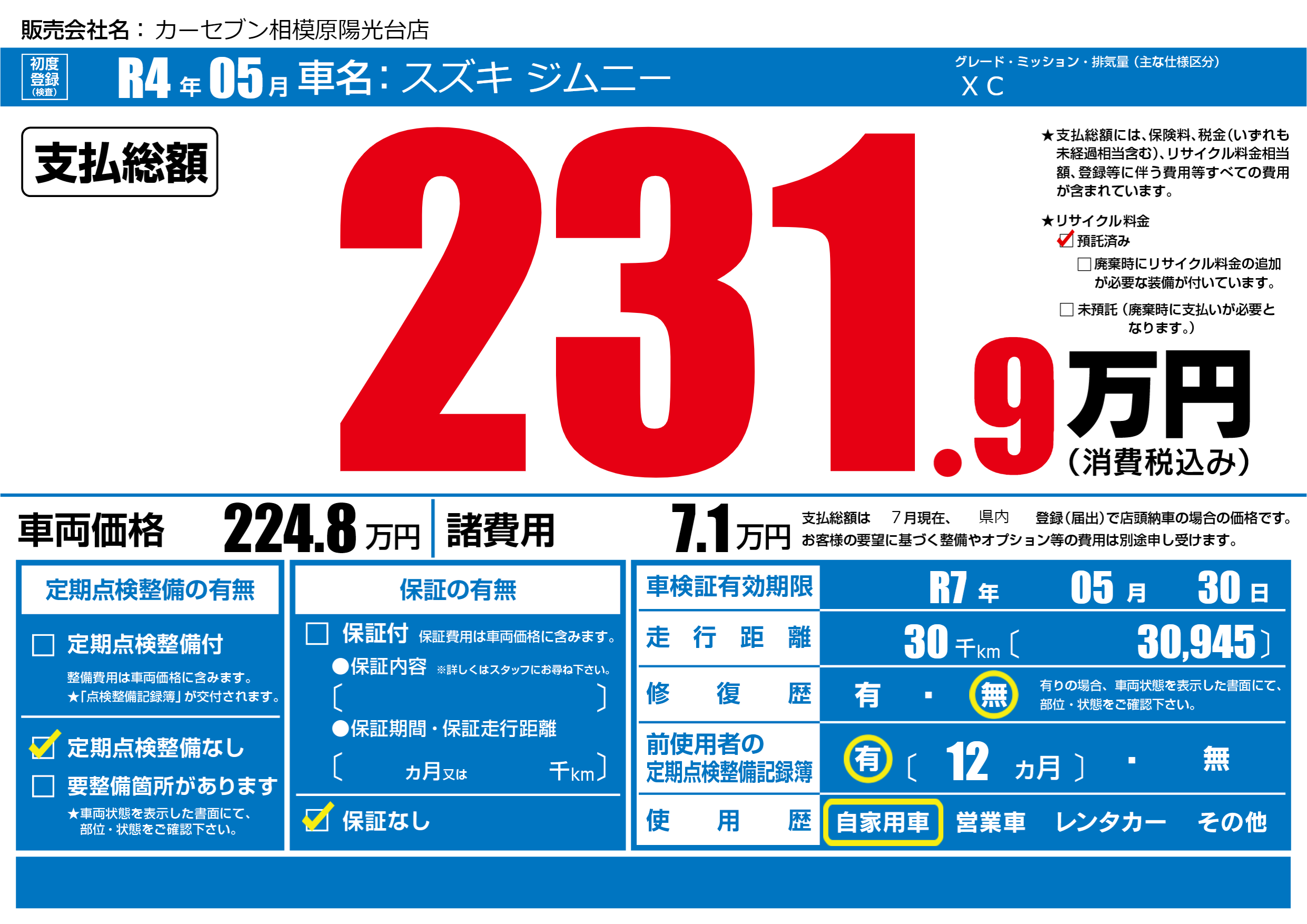 なし | 車検制限 | R7年05月30月 |