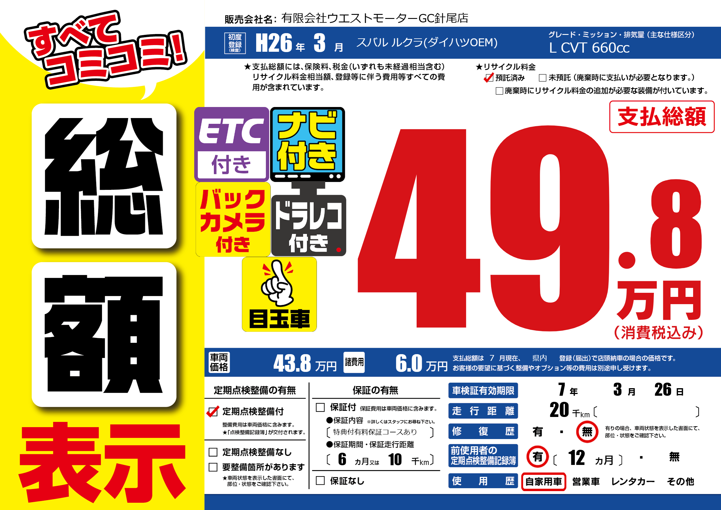 | 車名 | スバル ルクラ(ダイハツOEM) | グレード ミッション 排気量 |