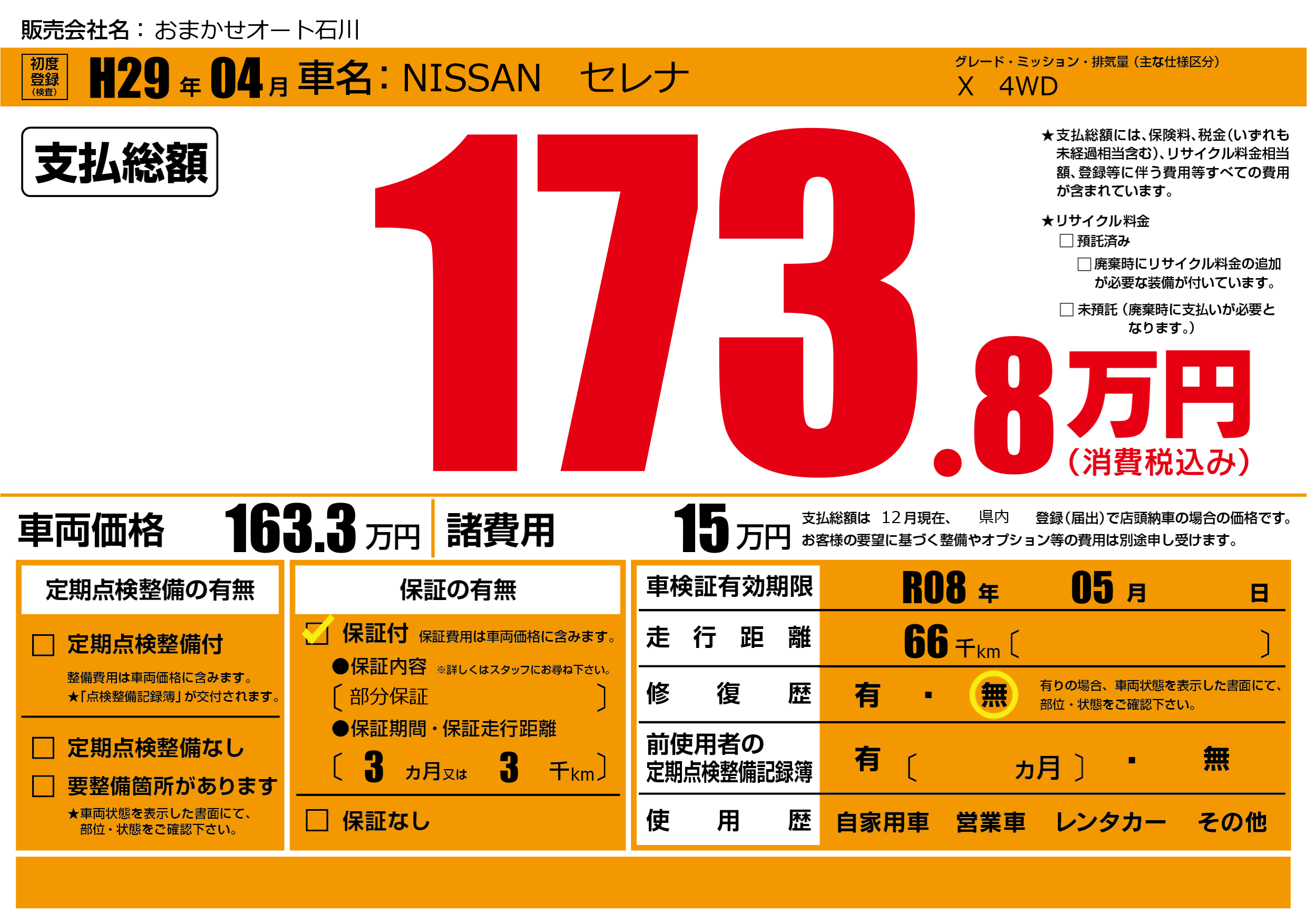 | 車名 | NISSAN セレナ | グレード ミッション 排気量 |