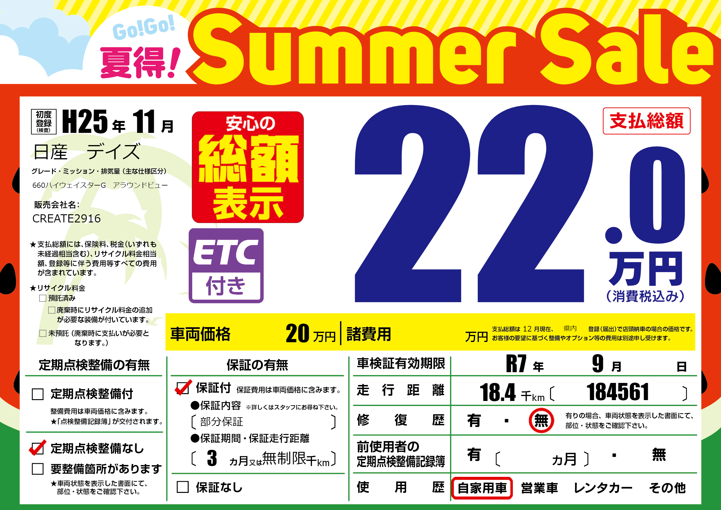 | 車名 | 日産 デイズ | グレード ミッション 排気量 |