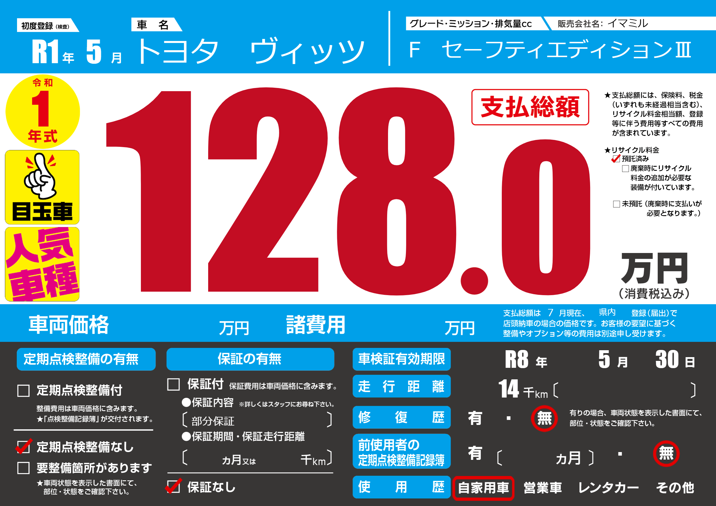 | 走行キロ | 1.4万km | 初年度登録 | R1年5月 |