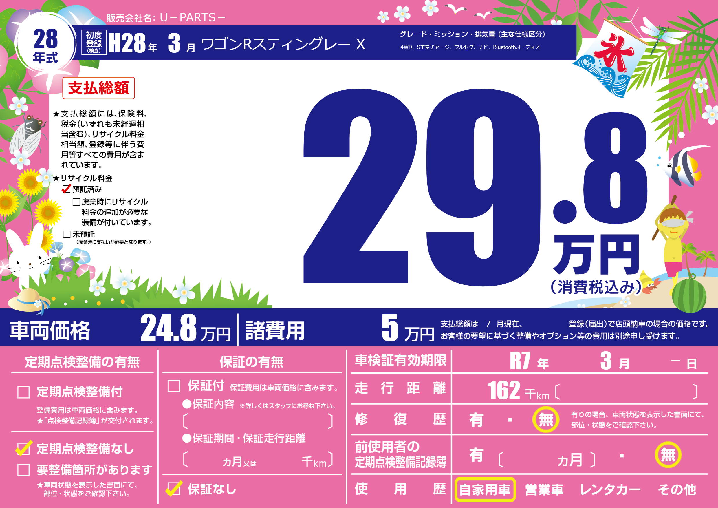 | 車名 | ワゴンRスティングレー X | グレード ミッション 排気量 |