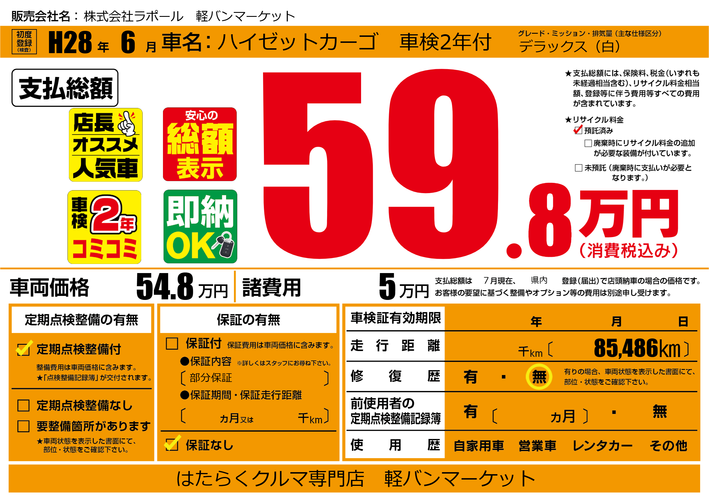 保証なし 保証内容(部分保証) ---ヶ月または()千kmまで |