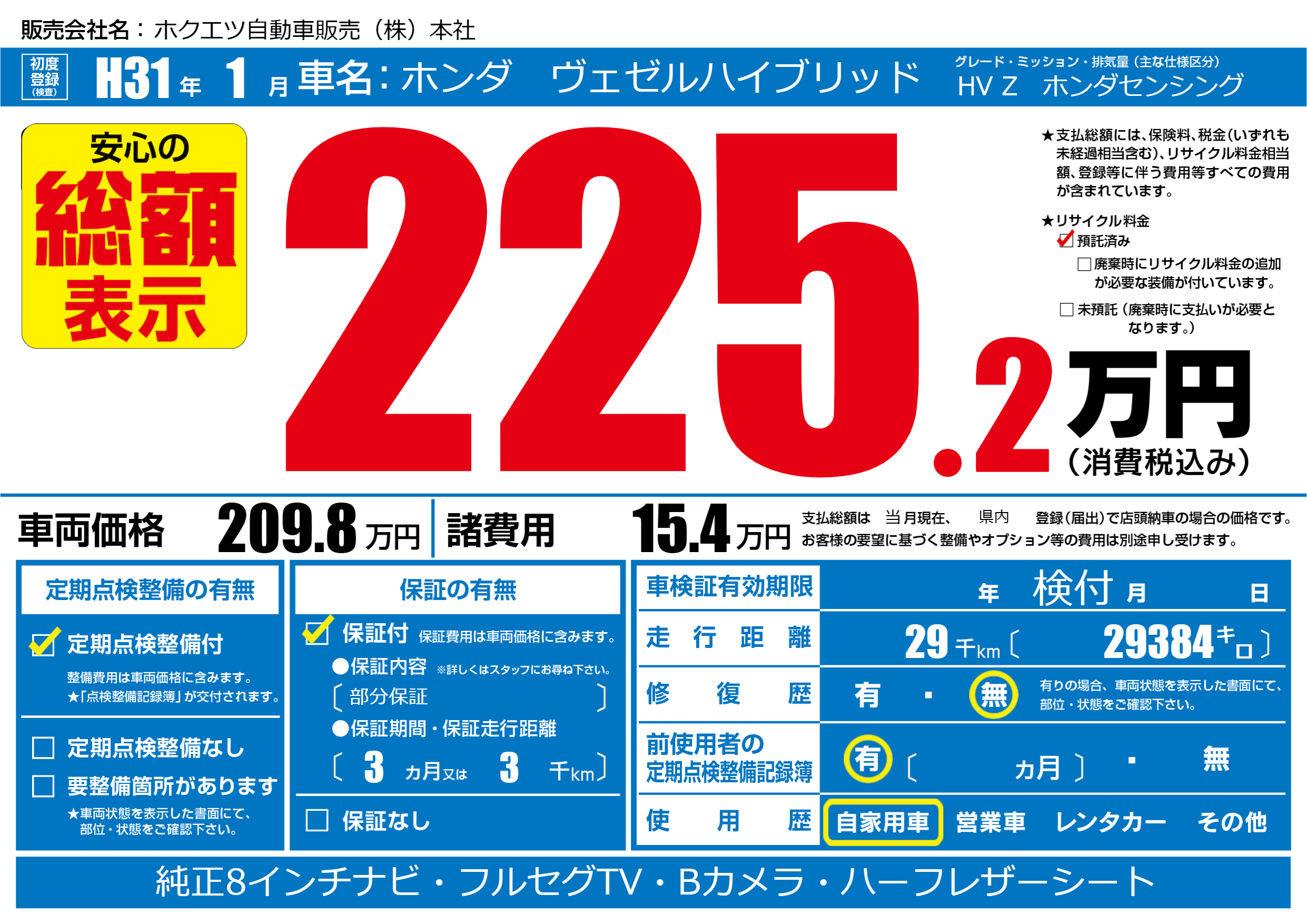 | 車名 | ホンダ ヴェゼルハイブリッド | グレード ミッション 排気量 |